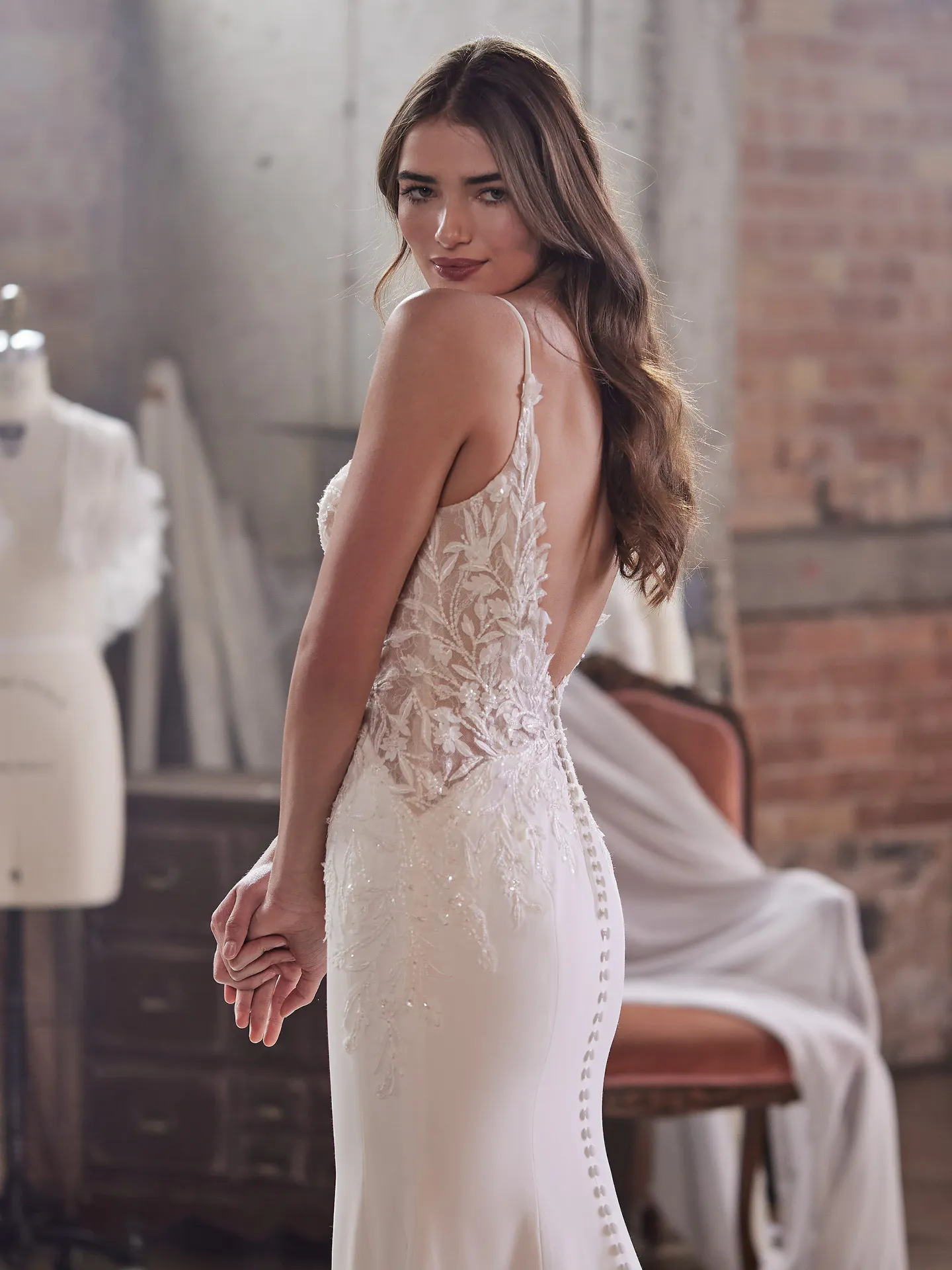 The Rebecca Ingram Crepe and Lace Sheath Wedding Dress offers the perfect combination of elegance, modernity, and comfort for San Diego brides. The sheath silhouette creates a sleek, streamlined look that hugs your body from the bodice to the hemline, while the lace detailing adds a touch of timeless romance. Designed with an illusion back and illusion neckline, this gown offers a delicate, ethereal aesthetic that is both modern and feminine. The V-neck and V-back features add a flattering and sophisticated touch to the overall design, perfect for brides who seek a chic yet comfortable gown for their wedding day. Ideal for San Diego weddings, this dress transitions beautifully from beach ceremonies to formal ballroom celebrations, ensuring you feel confident and stunning on your special day.