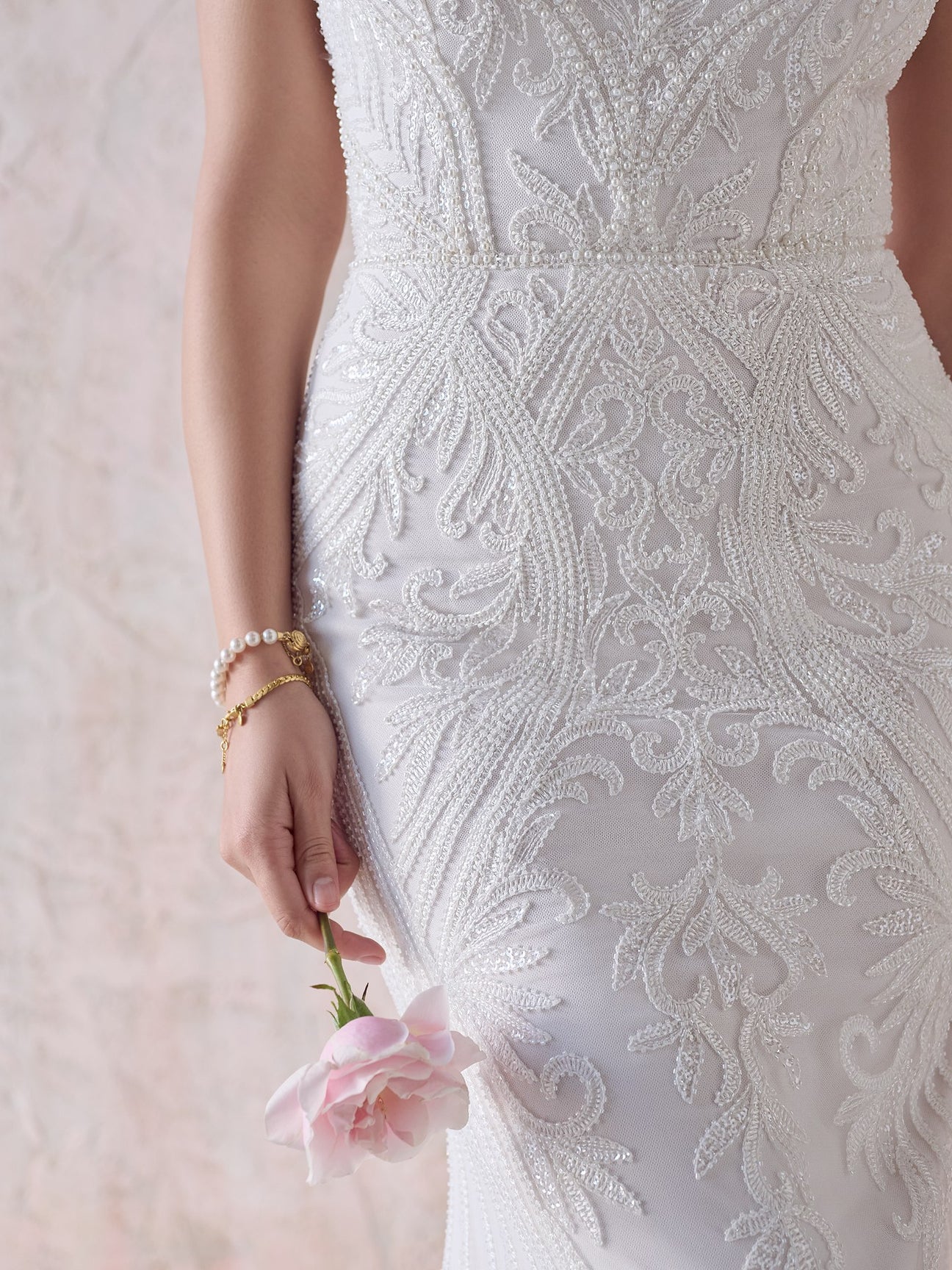 The V-neckline and V-back are modern bridal features that create a sleek, elongated figure. The Maggie Sottero gown with its V-neckline accentuates the face, while the V-back adds a touch of elegance and sophistication. These features combine for a flattering and comfortable fit, making the gown perfect for San Diego brides looking for a balance between contemporary design and classic elegance.