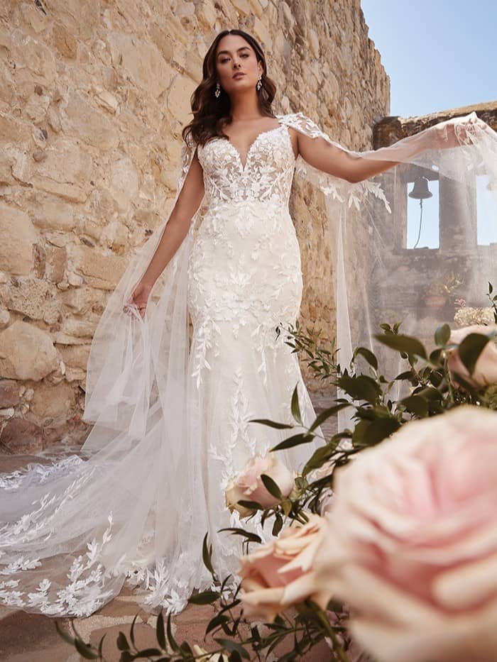 The Casablanca Fit-and-Flare Wedding Dress is a standout choice for San Diego brides seeking a gown that combines romantic lace, sexy elegance, and timeless sophistication. The lace detailing, plunge neckline, and V-back create a stunning design that is both modern and classically romantic, making it perfect for a variety of wedding themes and venues. The fit-and-flare silhouette is ideal for plus-size brides, enhancing their curves while maintaining comfort and ease of movement.