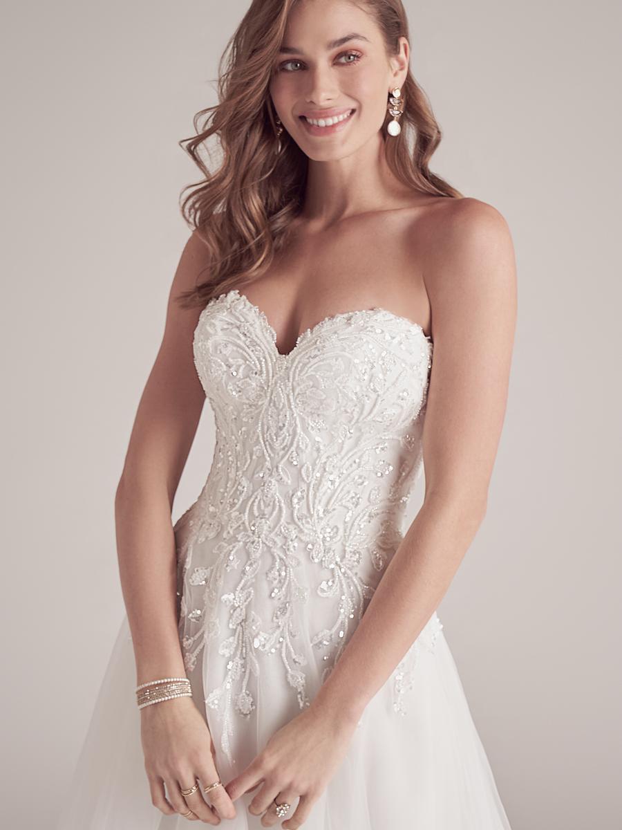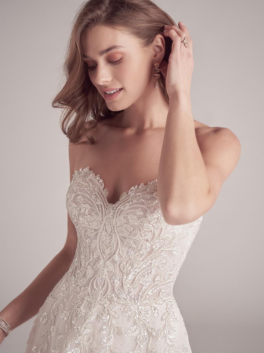 Lace wedding dresses are synonymous with romance, and the Maggie Sottero lace gown is no exception. The lace detailing throughout the gown adds texture and dimension, creating a soft and feminine aesthetic. Paired with the sweetheart neckline, this gown offers a romantic, timeless look that flatters the bride’s upper body. The strapless design ensures a clean, streamlined silhouette while offering comfort and support. The combination of lace, tulle, and the sweetheart neckline creates a stunning bridal look that will turn heads at any San Diego wedding.