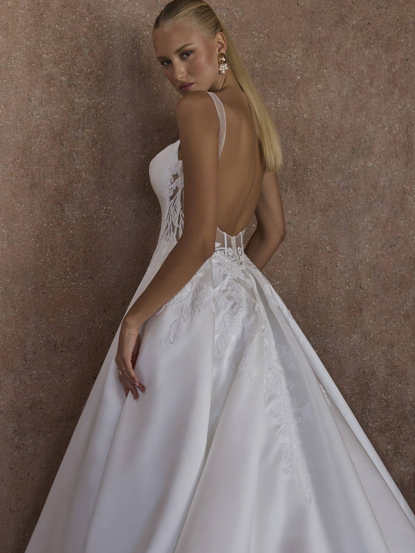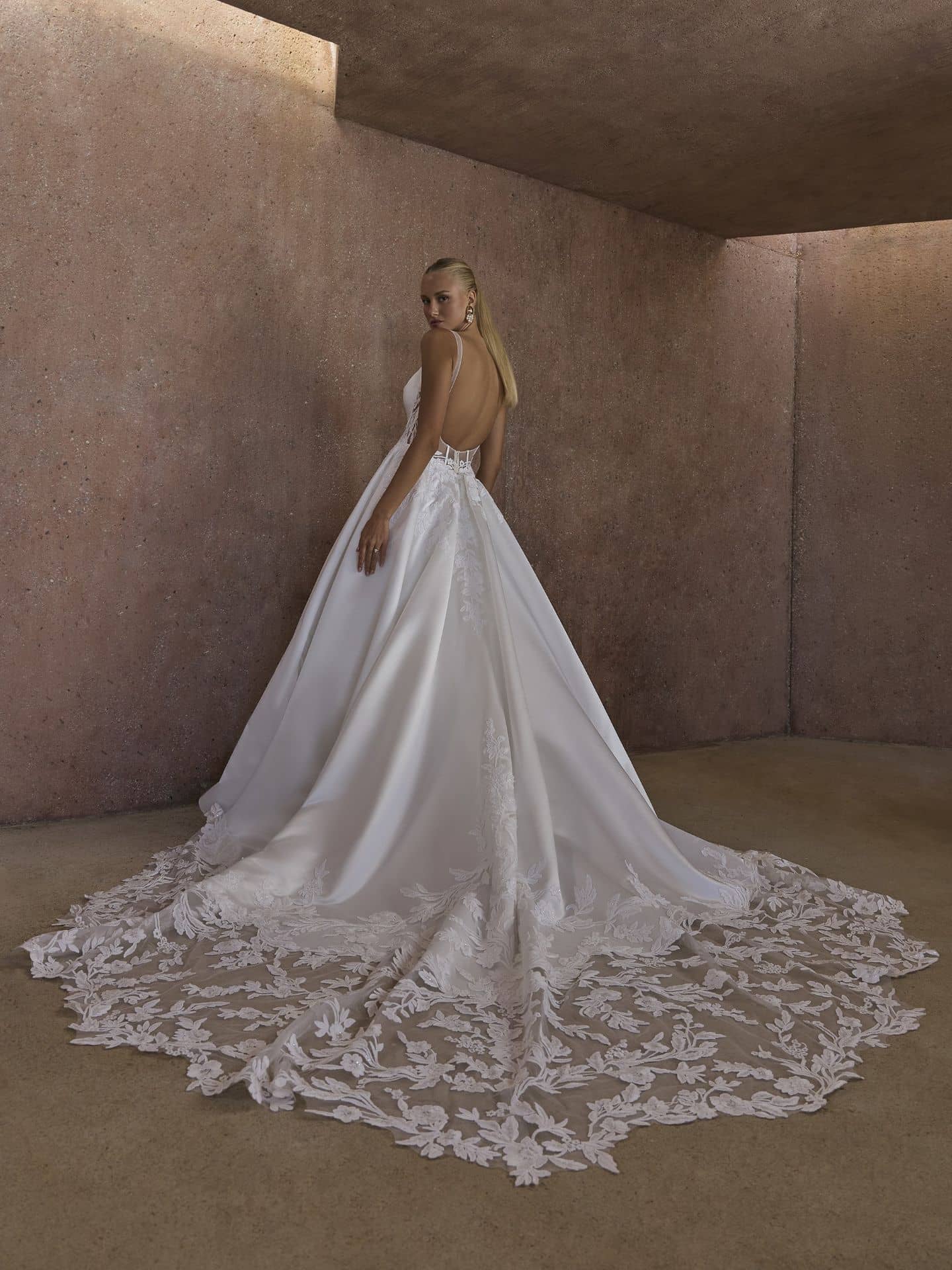 For brides who are looking for a gown that exudes luxury and sophistication, lace and satin ball gowns from Casablanca Bridal offer the perfect combination. Satin adds a rich, smooth texture, while lace detailing creates a delicate, vintage-inspired aesthetic. The gown’s plunge neckline and low back designs provide a modern edge, making these gowns perfect for brides who want both glamour and grace.