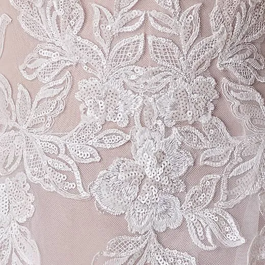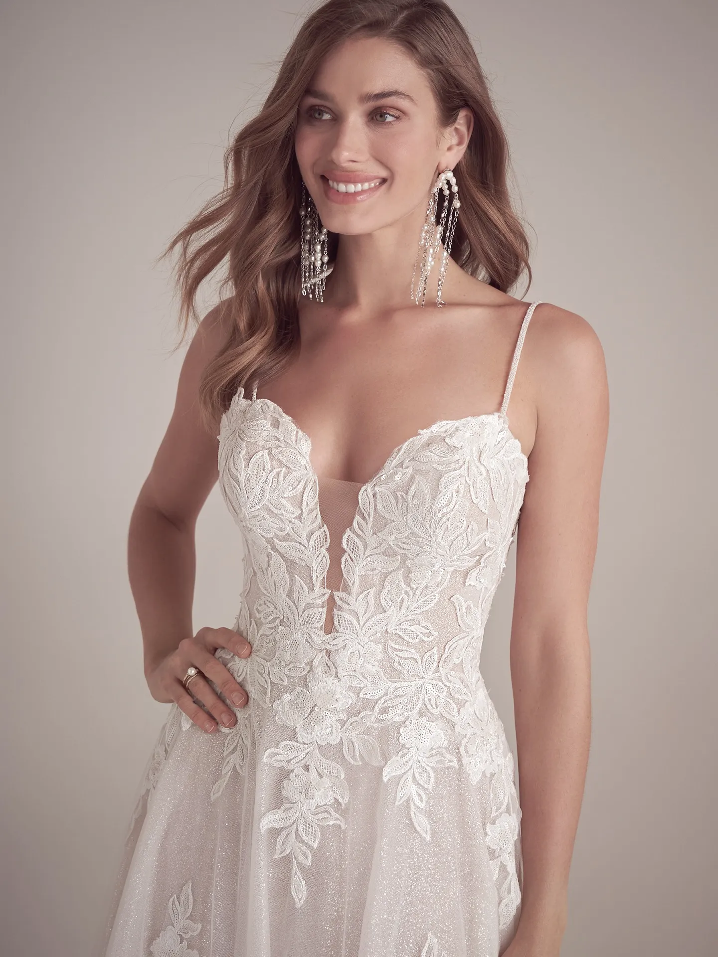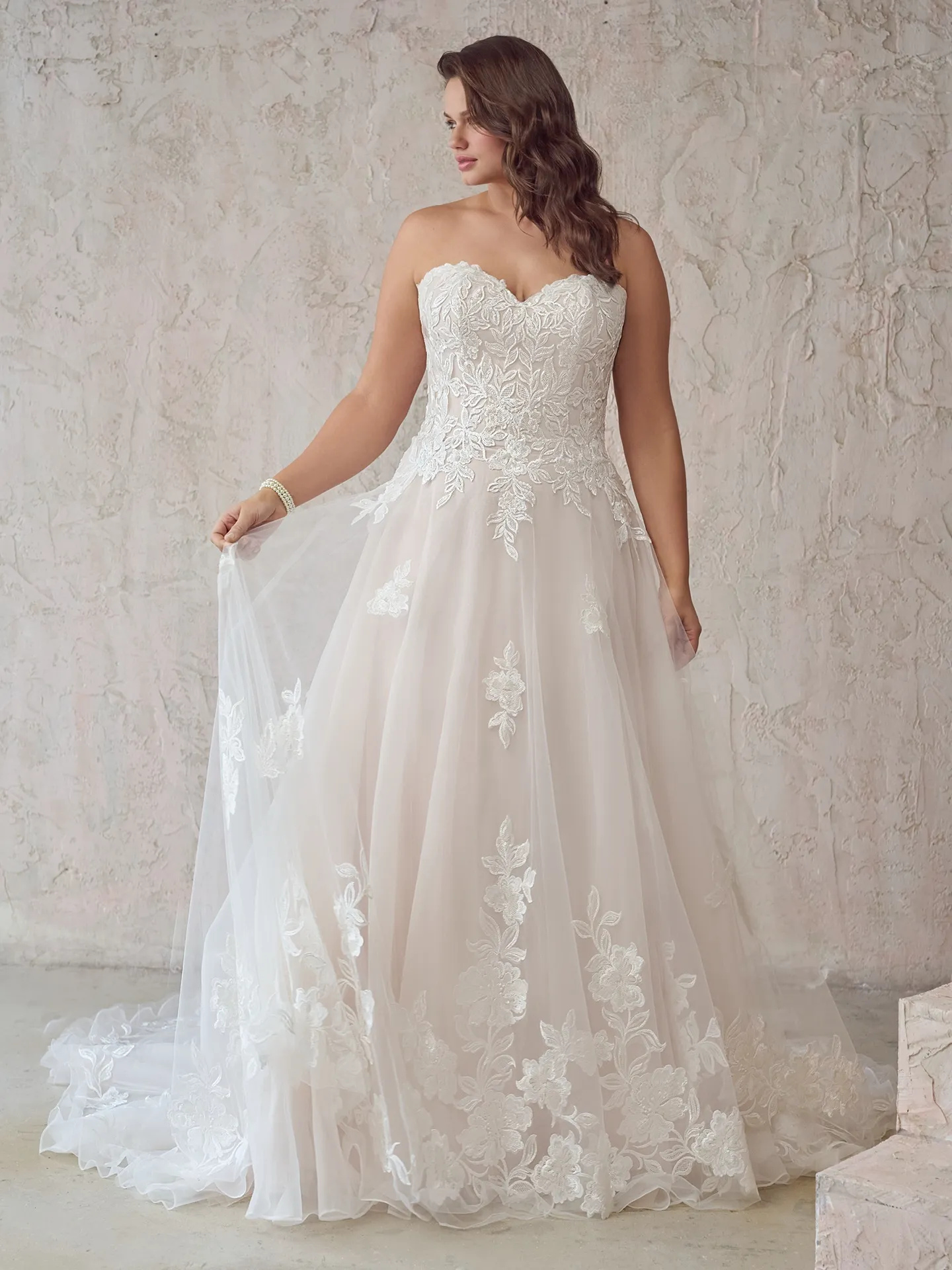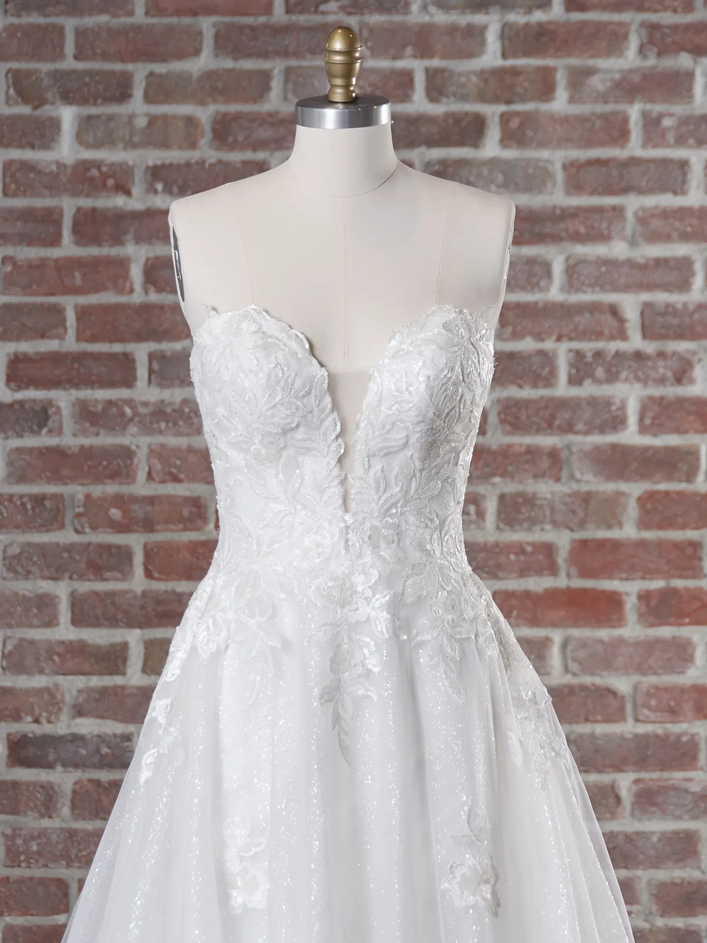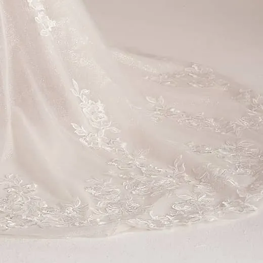 The A-line wedding dress is a favorite choice for San Diego brides due to its universally flattering fit. The design gently flares from the waist, creating a smooth, balanced look that accentuates the bride’s natural shape. The Maggie Sottero A-line lace gown enhances this classic silhouette with delicate lace detailing and a tulle skirt, adding texture and volume without being too heavy. Whether for a romantic beach wedding or a formal ballroom affair, the A-line silhouette guarantees comfort, grace, and timeless beauty.