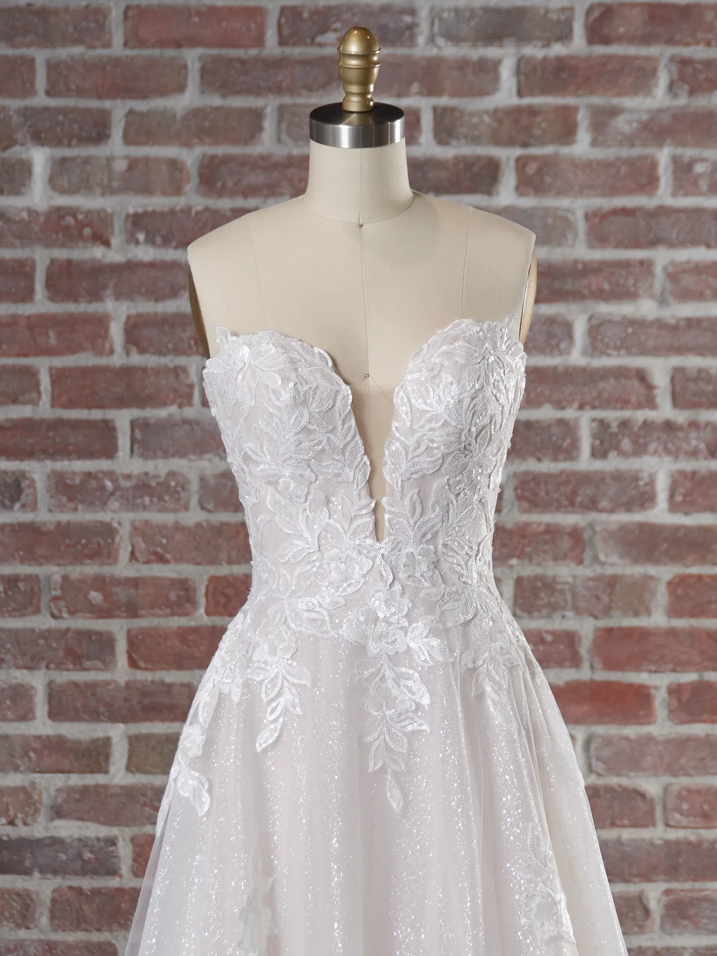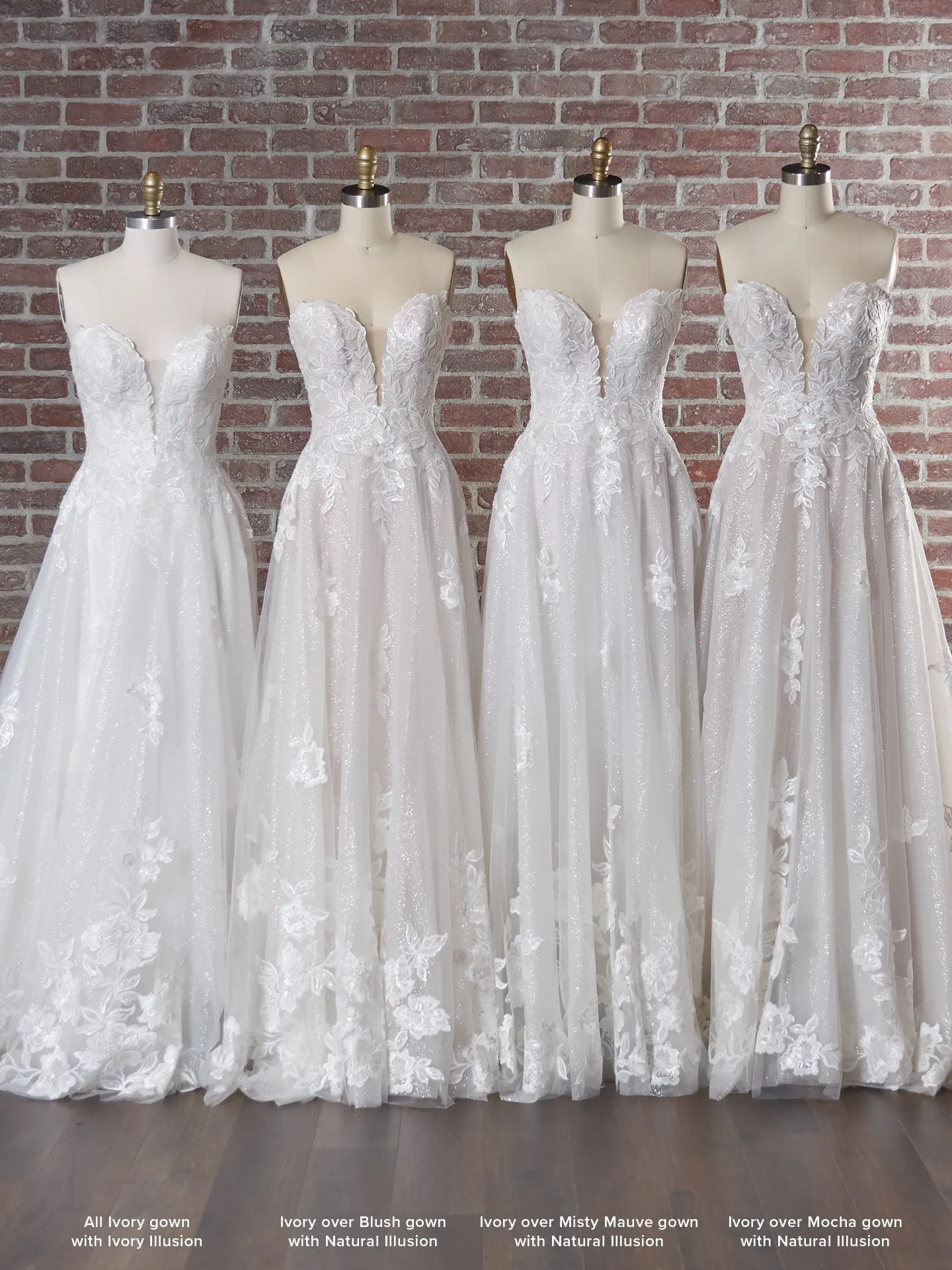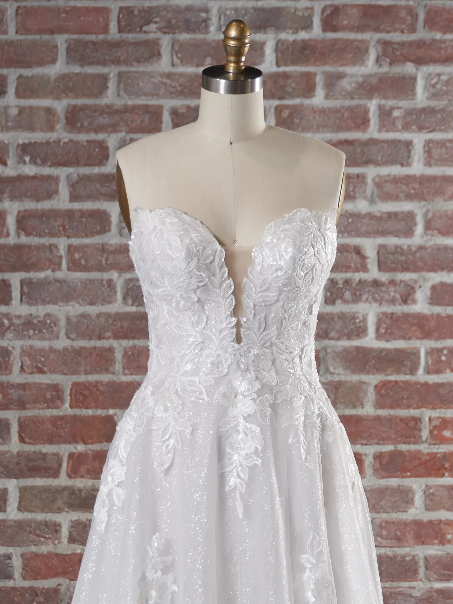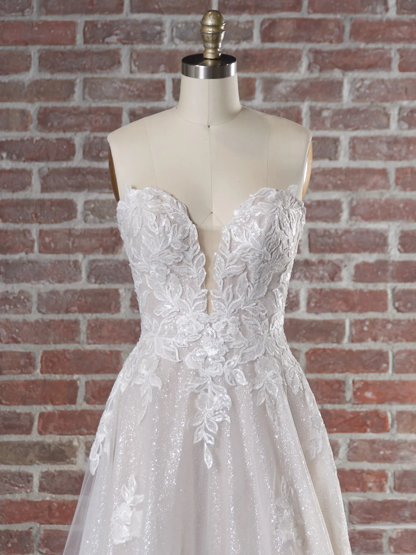 The A-line wedding dress is a favorite choice for San Diego brides due to its universally flattering fit. The design gently flares from the waist, creating a smooth, balanced look that accentuates the bride’s natural shape. The Maggie Sottero A-line lace gown enhances this classic silhouette with delicate lace detailing and a tulle skirt, adding texture and volume without being too heavy. Whether for a romantic beach wedding or a formal ballroom affair, the A-line silhouette guarantees comfort, grace, and timeless beauty.