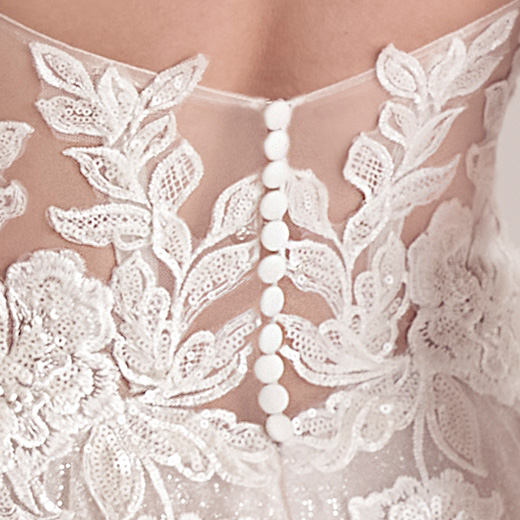At Bridal and Tuxedo Galleria, we understand that every bride wants to look and feel her best on her wedding day. That’s why we offer a carefully curated selection of Maggie Sottero bridal gowns, including this lace A-line dress. The gown’s illusion sleeves, long sleeves, and straps provide support and comfort while maintaining a feminine, romantic aesthetic. The A-line silhouette is universally flattering and works beautifully for all body types. Whether you’re planning a grand wedding or a smaller, more intimate celebration in San Diego, this gown is designed to make you feel special and beautiful.
