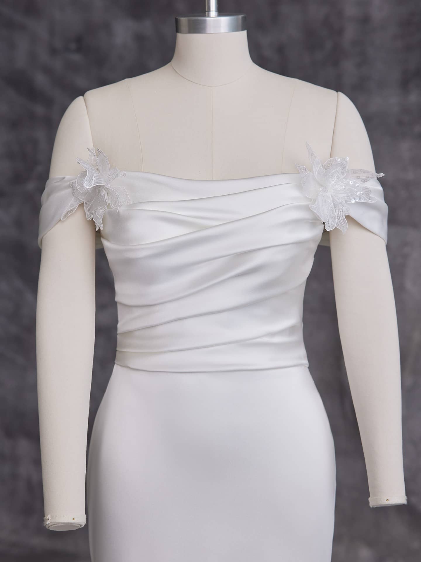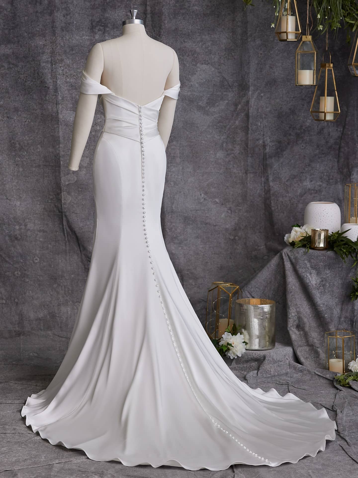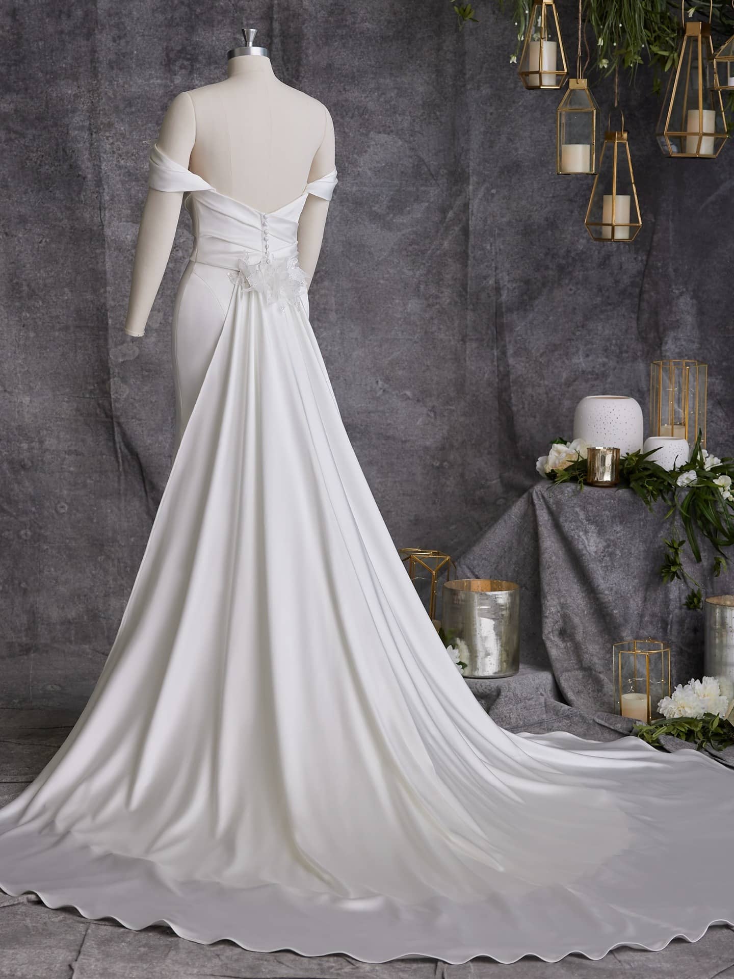 The off-shoulder scoop neckline adds a touch of romance and elegance to the Maggie Sottero gown. This neckline is universally flattering, elongating the bride’s neck and drawing attention to her collarbones. The addition of cap sleeves offers a delicate and romantic touch, giving the dress a feminine and chic feel. The combination of the off-shoulder design and scoop neckline works perfectly with the sheath silhouette, ensuring that the bride feels both confident and graceful on her special day. For San Diego brides seeking a gown that blends modern style with romantic details, this dress is an excellent choice.