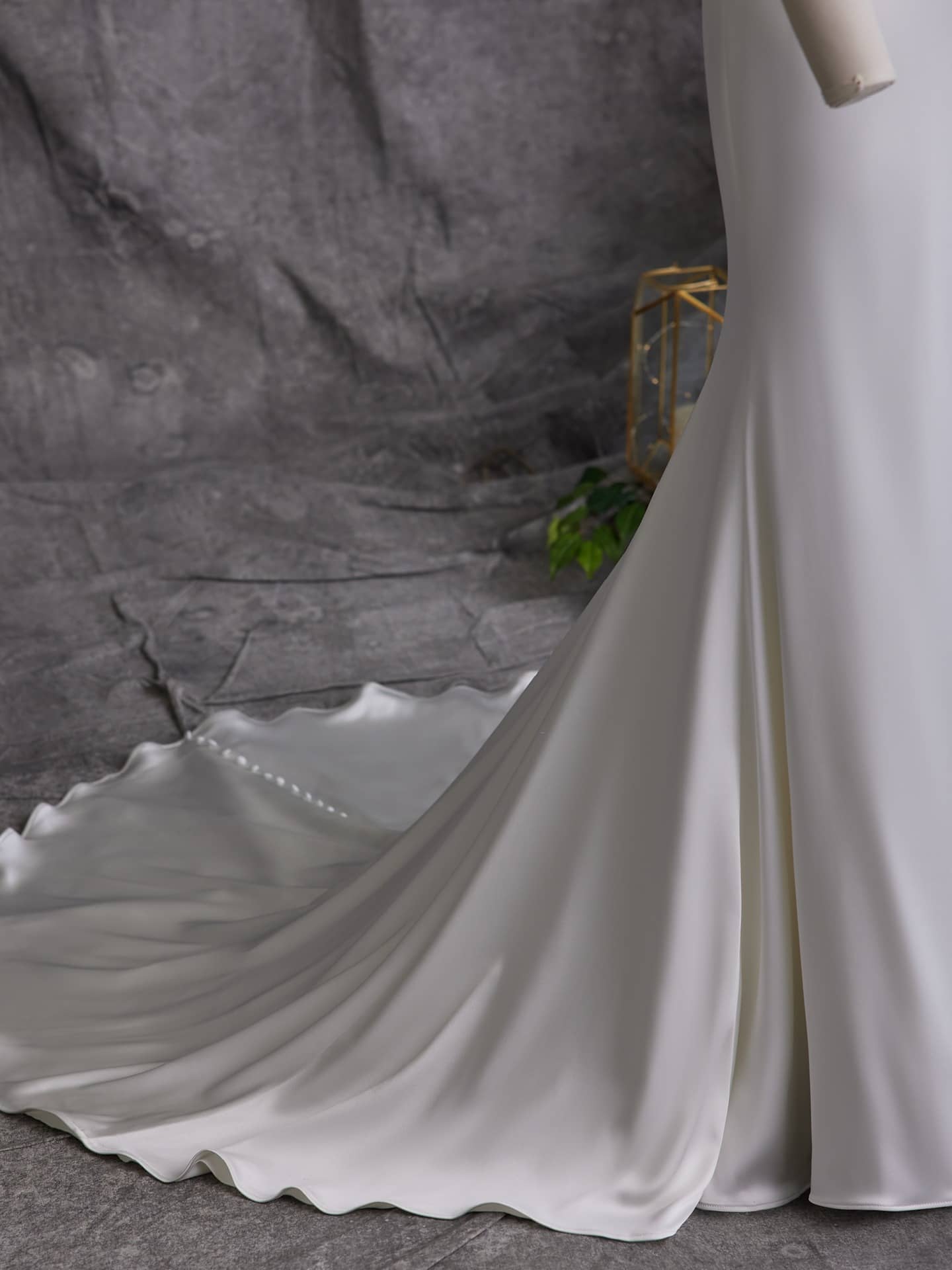 The sheath wedding dress is an elegant, streamlined silhouette that flatters the bride’s natural shape. The Maggie Sottero Mikado sheath gown offers a sleek fit that hugs the body from top to bottom, ensuring a flattering, modern look. The Mikado satin fabric provides structure and luxury, while the sheath silhouette allows for ease of movement, making this gown perfect for San Diego brides who want a stylish yet comfortable dress. Whether you’re walking down the aisle at a luxurious ballroom or exchanging vows in a more casual setting, this dress ensures you look your best.