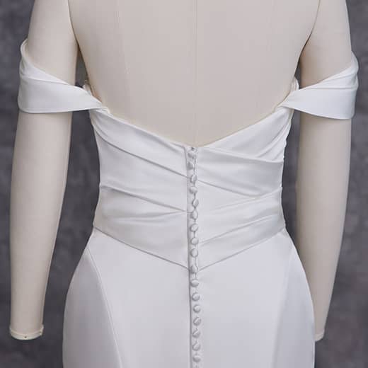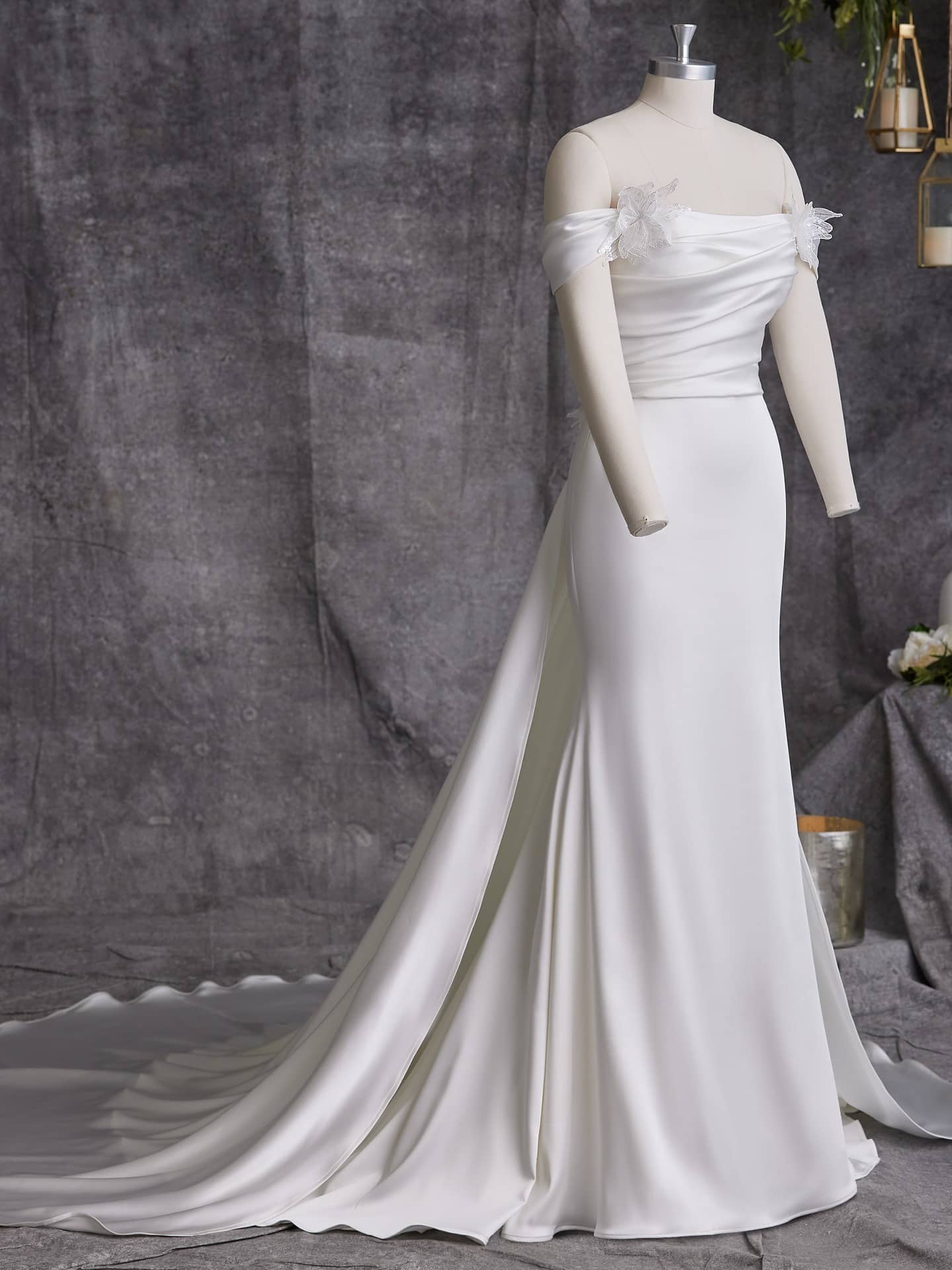 The Maggie Sottero Mikado Sheath Wedding Dress is a perfect combination of classy sophistication and modern elegance, making it an ideal choice for San Diego brides seeking a gown that exudes timeless beauty and comfort. Featuring Mikado satin, this gown has a luxurious, structured feel that enhances the bride’s natural shape. The sheath silhouette offers a sleek and flattering design, hugging the body without sacrificing comfort. The off-shoulder scoop neckline adds a feminine, romantic touch, while the V-back offers a chic, contemporary style. The addition of tulle fabric ensures an ethereal quality, making the gown perfect for both formal San Diego weddings and more casual celebrations. Whether you’re walking down the aisle in a grand ballroom or exchanging vows at an intimate outdoor venue, this gown will make you feel stunning and confident.