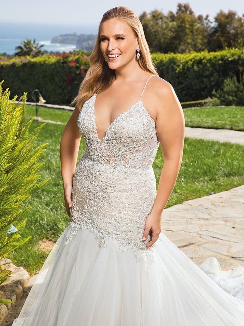 The Casablanca Plus-Size Fit-and-Flare Wedding Dress is the ideal choice for San Diego brides who seek a combination of romantic elegance and modern sensuality. This dress is designed to make brides feel confident, stylish, and comfortable on their wedding day. Featuring a bold plunge neckline, a delicate strappy back, and a flattering V-back, this gown offers both sexy appeal and timeless charm. The fit-and-flare silhouette enhances the bride’s curves, hugging the body at the waist and hips before flaring out elegantly to create a dramatic, yet graceful, bridal look.