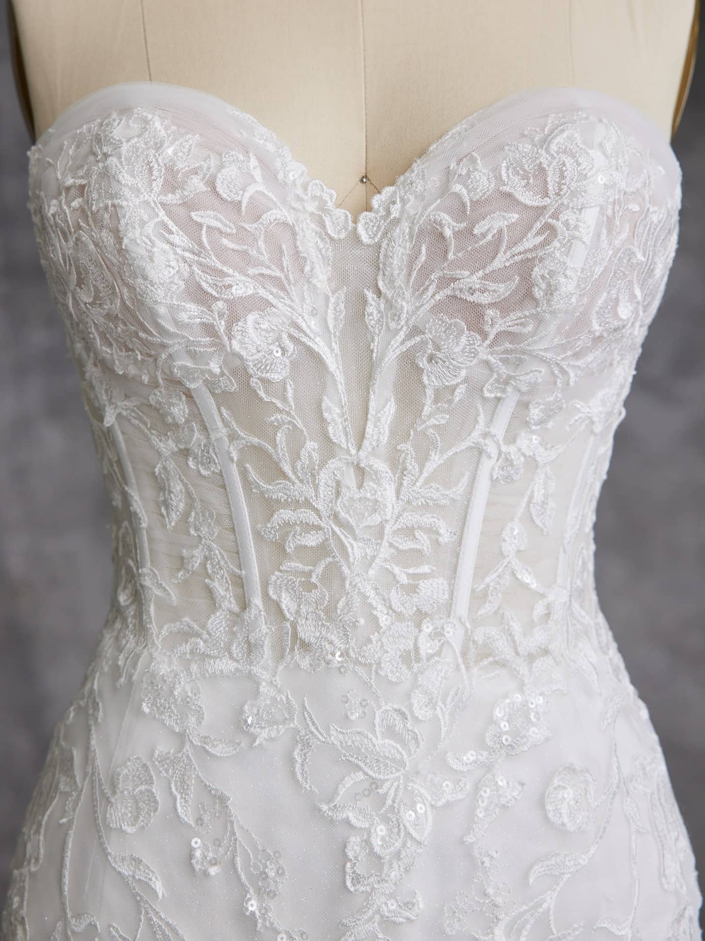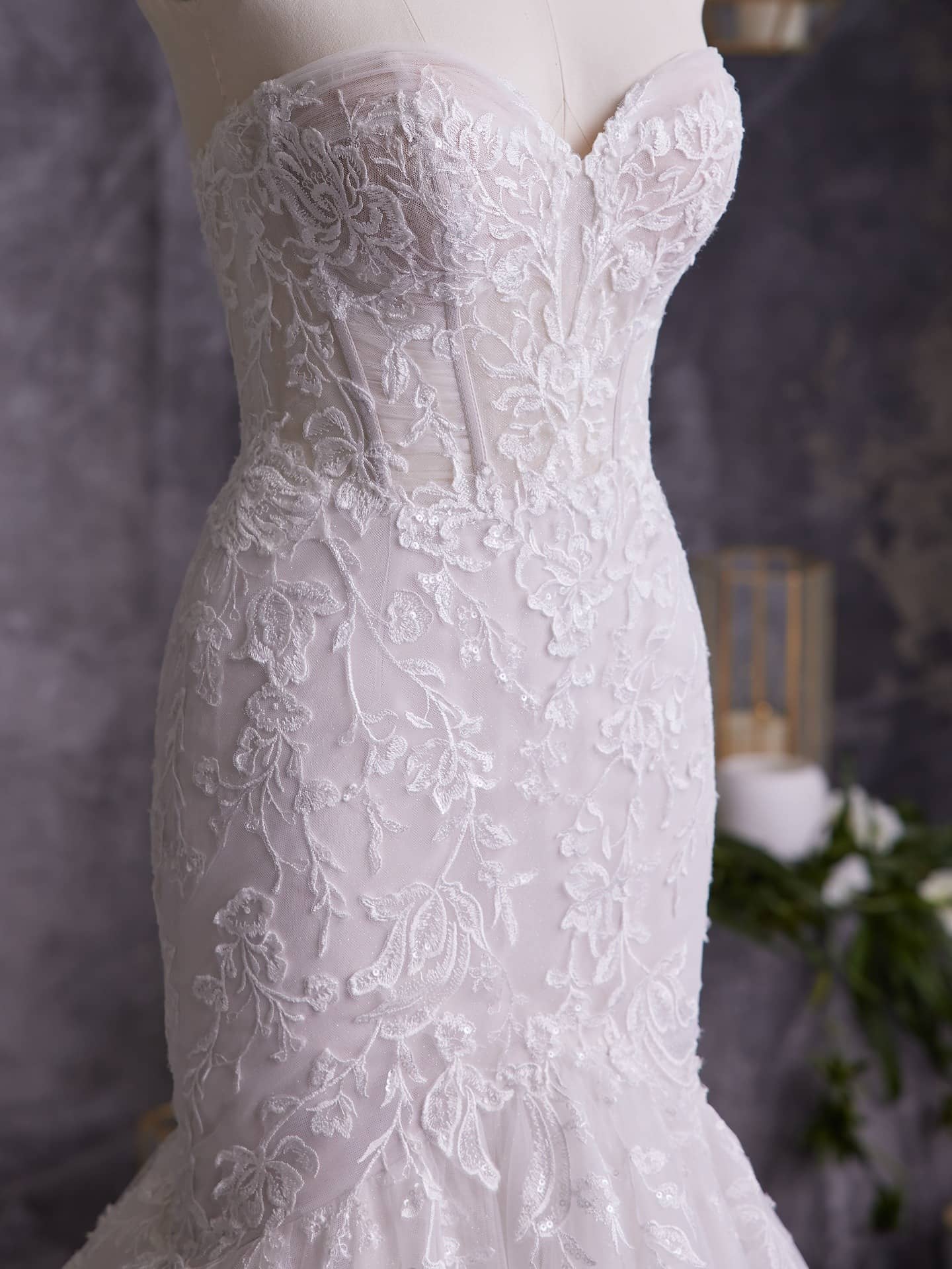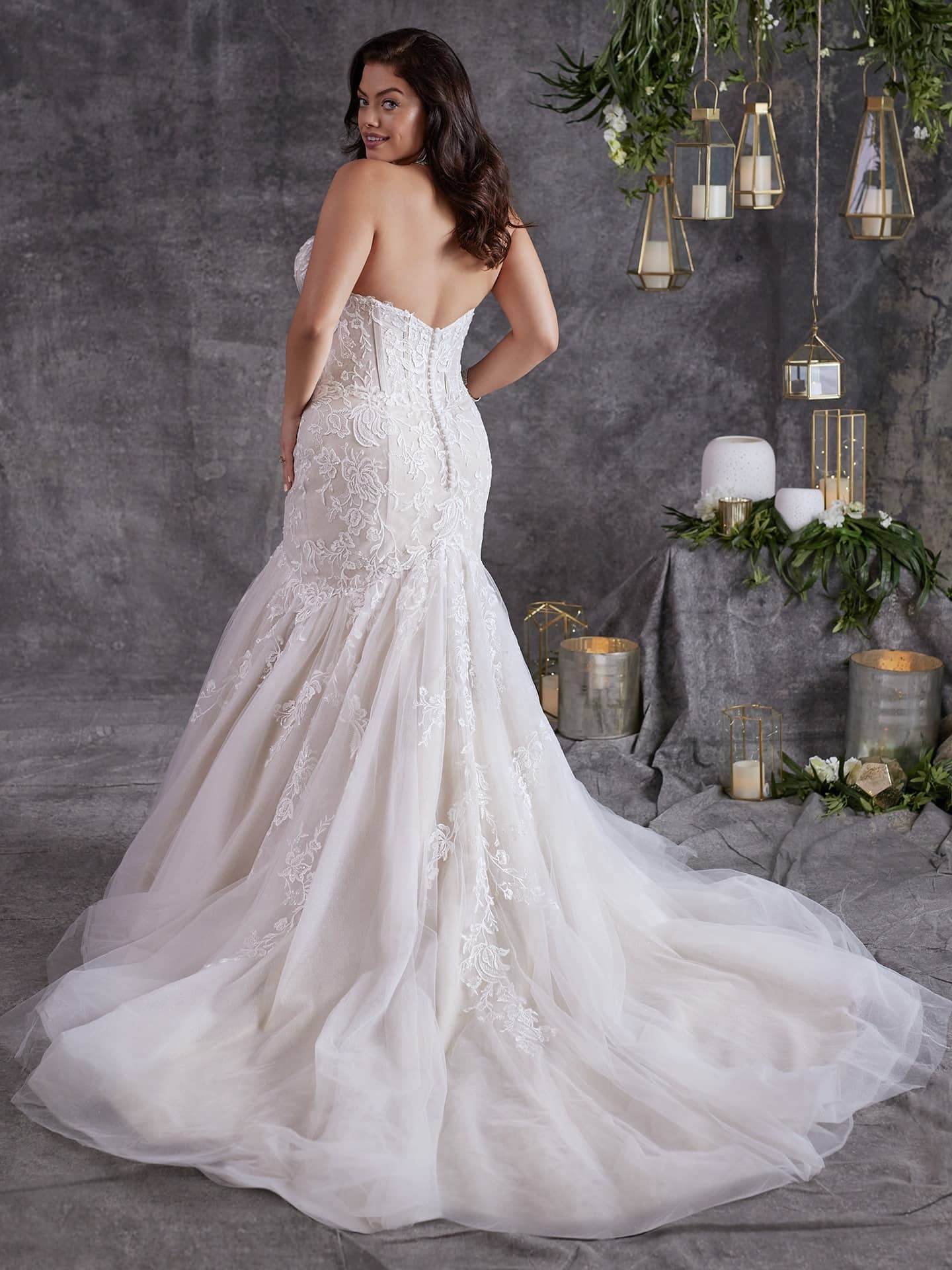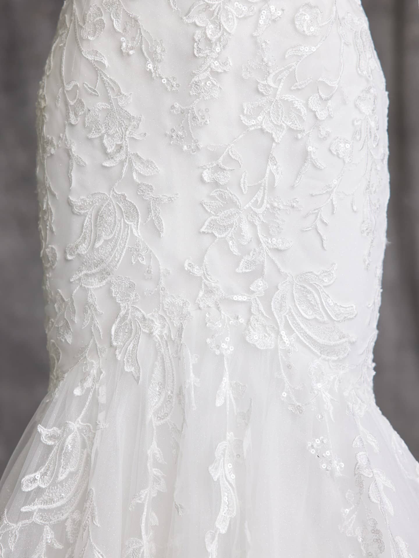 Lace wedding dresses are timeless, and the Maggie Sottero lace gown is no exception. The intricate lace detailing adds texture and depth, making the gown feel luxurious and romantic. Paired with the airy, delicate tulle, the dress achieves a sense of lightness and movement that is perfect for San Diego brides who want a wedding dress that flows with grace. The combination of lace and tulle ensures a soft, feminine look that complements the dramatic mermaid silhouette.