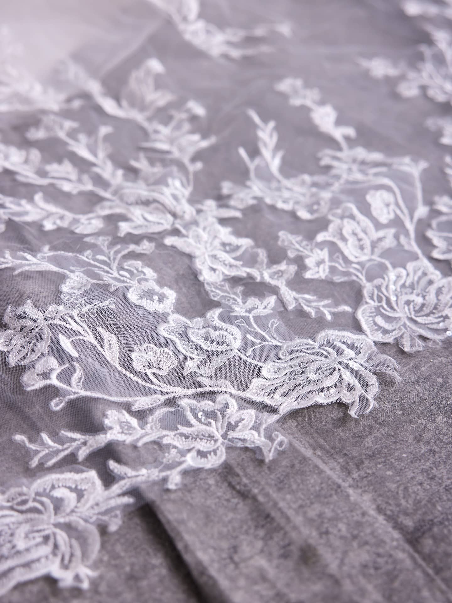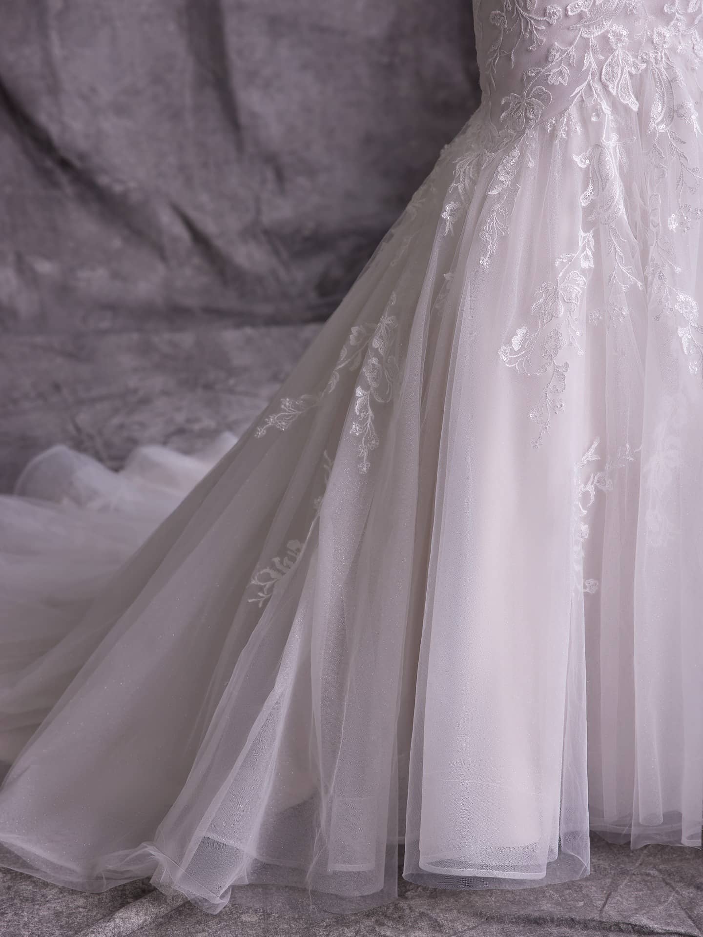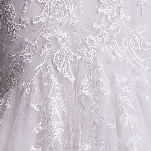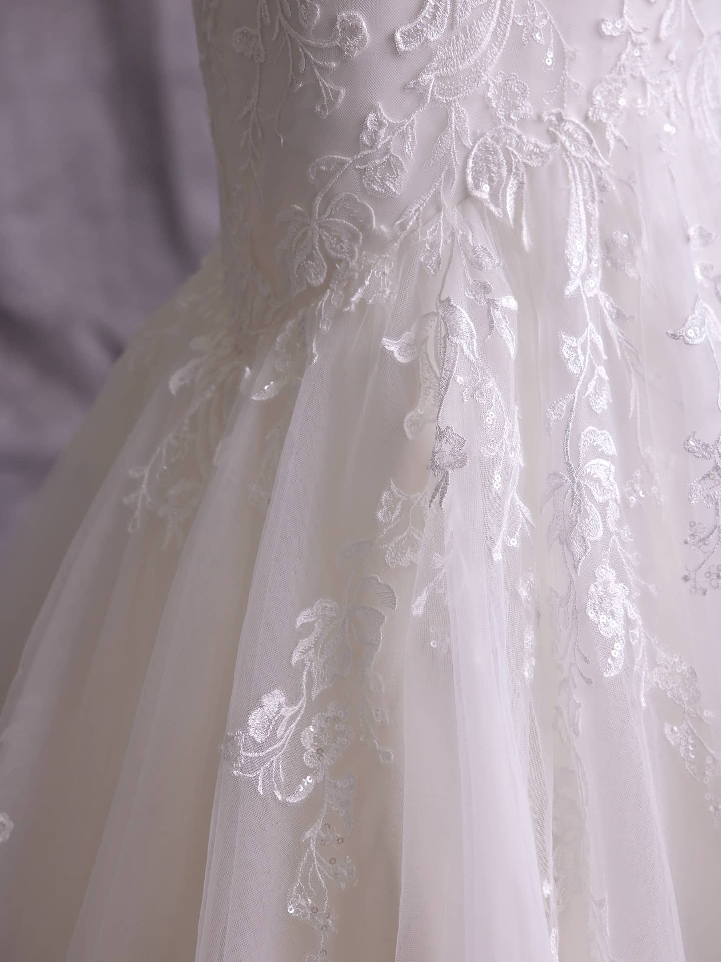 Lace wedding dresses are timeless, and the Maggie Sottero lace gown is no exception. The intricate lace detailing adds texture and depth, making the gown feel luxurious and romantic. Paired with the airy, delicate tulle, the dress achieves a sense of lightness and movement that is perfect for San Diego brides who want a wedding dress that flows with grace. The combination of lace and tulle ensures a soft, feminine look that complements the dramatic mermaid silhouette.