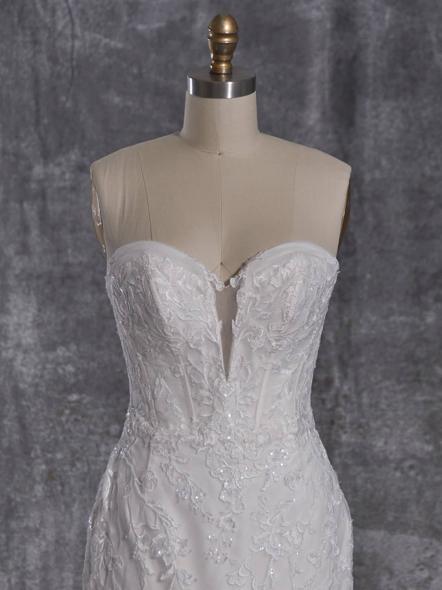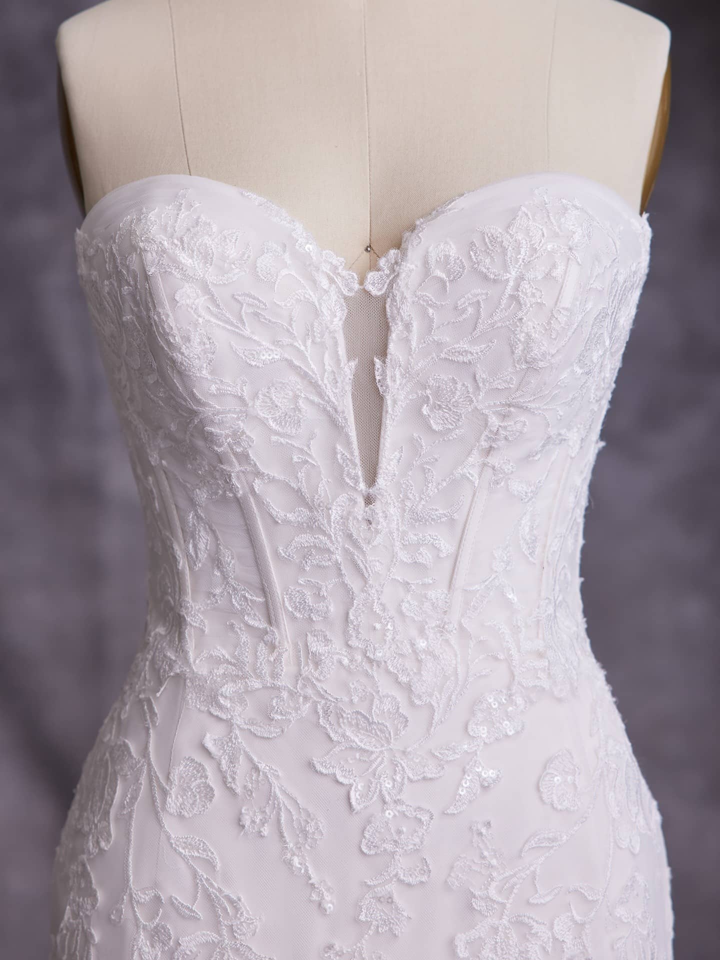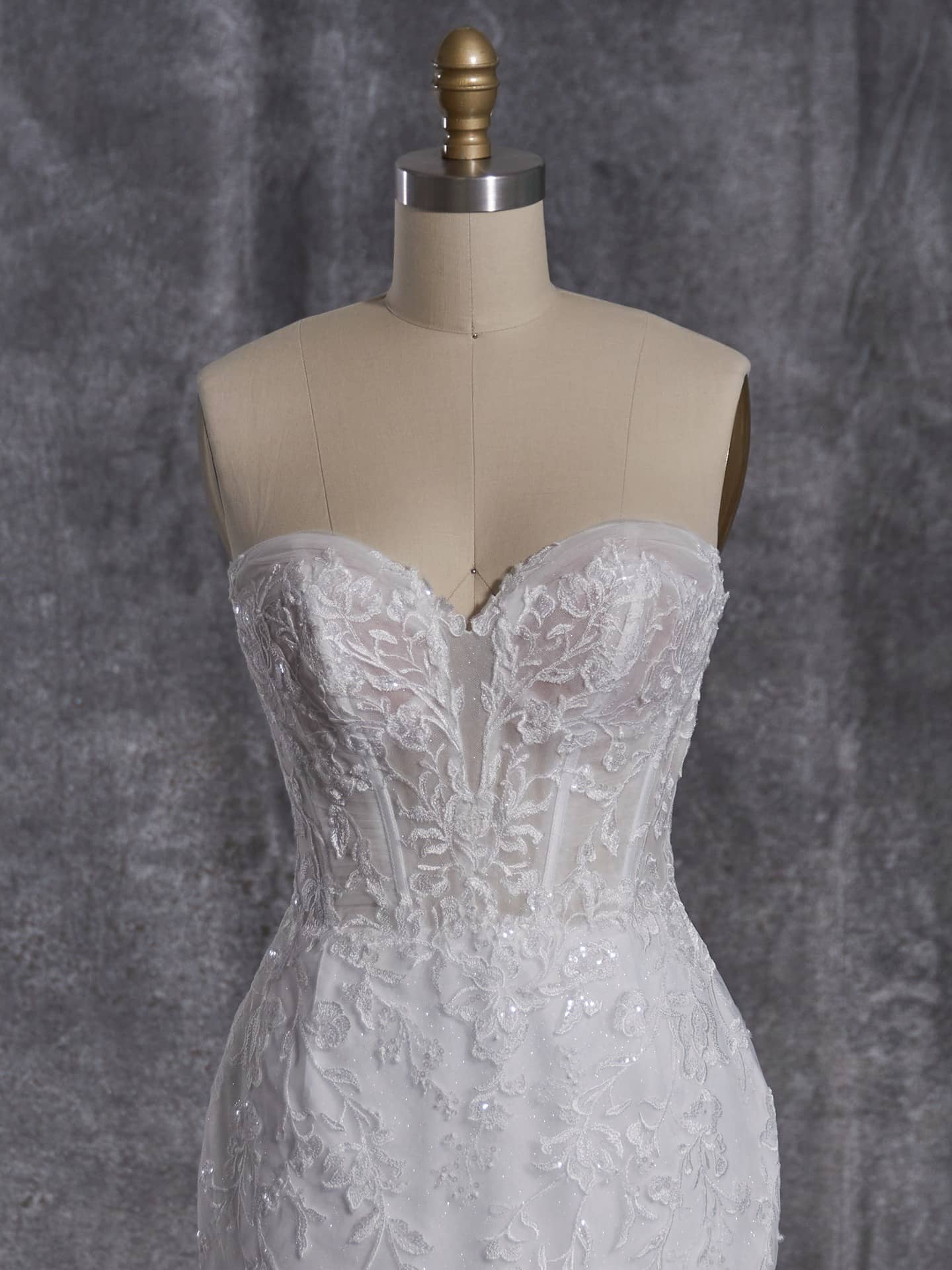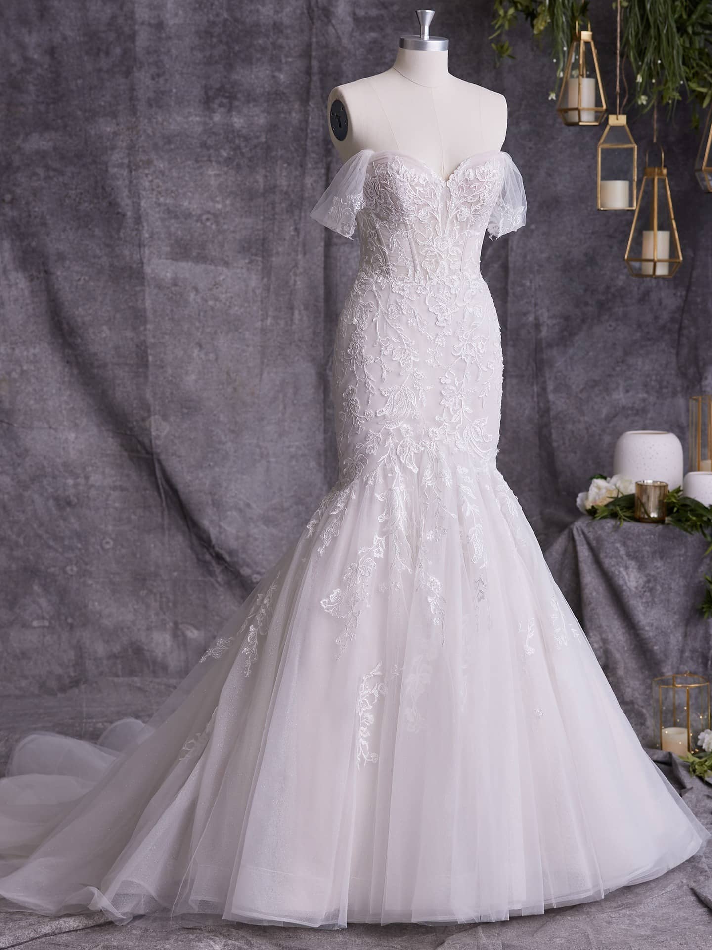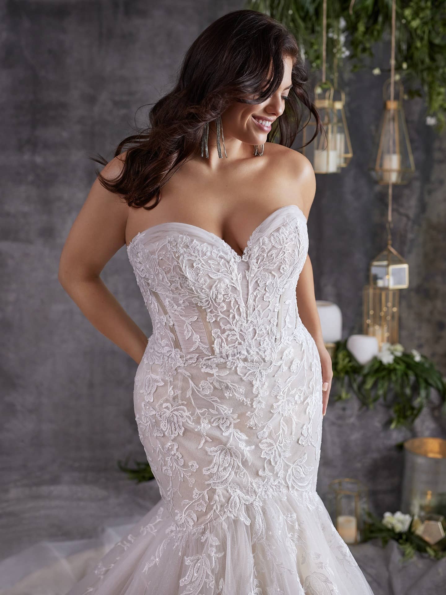 The Maggie Sottero Lace Mermaid Wedding Dress is the perfect combination of modern elegance and seductive charm, making it a top choice for San Diego brides who want to make a lasting impression. The mermaid silhouette hugs the body tightly from the bodice to the knees before flaring out, creating a dramatic hourglass figure that flatters all body types. The lace fabric adds a layer of texture and romance, while the off-shoulder sweetheart neckline enhances the bride’s natural beauty. The V-back gives the gown a modern, chic twist, making it perfect for brides who want a mix of traditional and contemporary styles. The strapless design ensures support and comfort while allowing the bride to move with ease. For San Diego brides seeking a gown that combines sensuality with sophistication, this dress is the perfect fit.