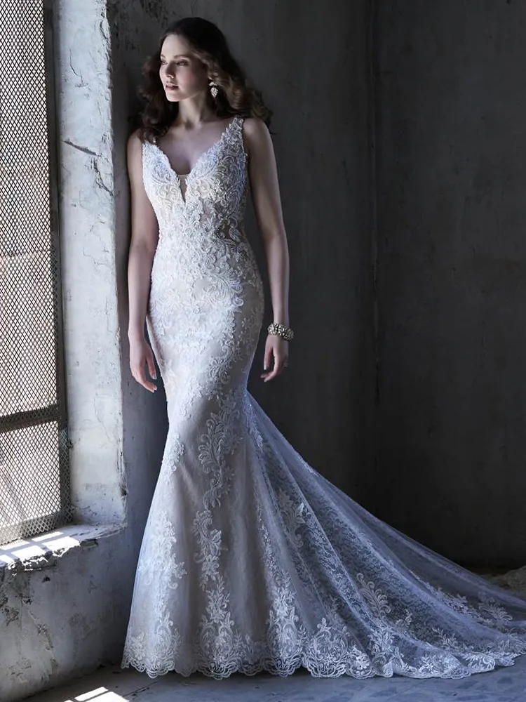 The fit-and-flare silhouette is a favorite among brides in San Diego for its ability to accentuate natural curves while offering the comfort of movement. This design hugs the body through the bodice and hips before flaring out gently at the bottom, creating a balanced, elegant shape. Ideal for beach weddings, ballrooms, or garden settings, the Maggie Sottero Fit-and-Flare Lace Gown offers a perfect blend of style and comfort.