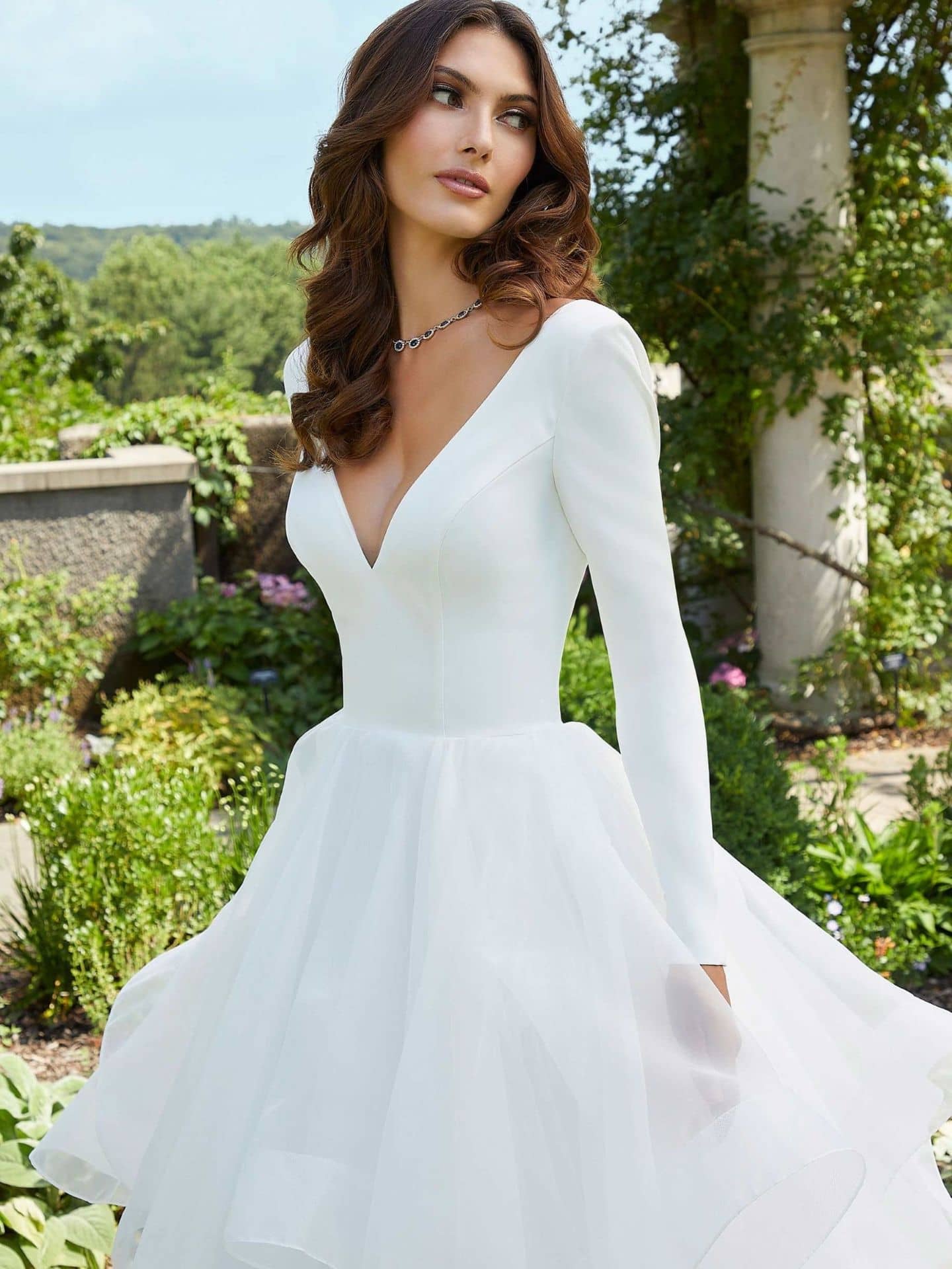 Featuring a V-neck front and dramatic V-back, our Morilee gowns flatter the figure and add a touch of modern sophistication. These cuts not only elongate the frame but also pair effortlessly with veils and statement accessories.