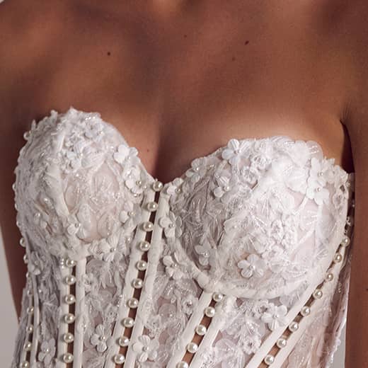 At Bridal and Tuxedo Galleria, we offer a curated selection of Maggie Sottero wedding gowns, including this stunning fit-and-flare crepe lace dress. Known for their superior craftsmanship, Maggie Sottero gowns combine classic bridal design with modern elements, offering San Diego brides the best of both worlds. The fit-and-flare silhouette is universally flattering and perfect for those who want a chic, streamlined look that still provides ample freedom to move. The lace detailing adds texture and romantic appeal, while the strapless sweetheart neckline creates a classic and elegant bridal look. The crepe fabric enhances the gown’s shape, providing a smooth, luxurious finish that will leave a lasting impression on your special day.