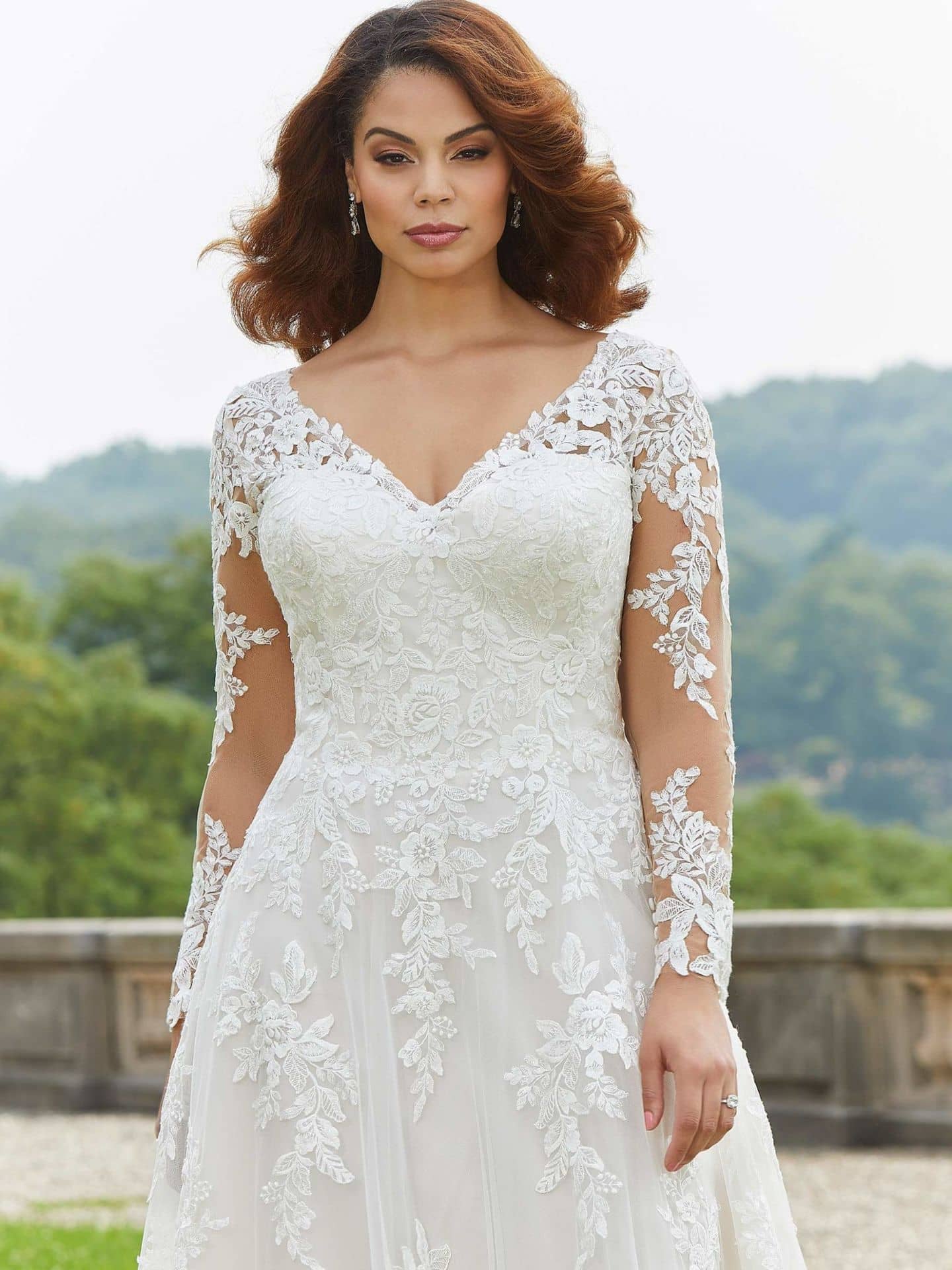 For brides who dream of a look that’s both modest and romantic, our Morilee V-neck A-Line wedding dresses with lace detailing offer the best of both worlds. These gowns are designed to honor the bride’s desire for sophistication while enhancing her natural shape with soft lines, structured bodices, and carefully placed lace embellishments. The modest V-neckline creates an elongated frame while maintaining elegance, making it a favorite among brides looking for graceful styling without excessive exposure.
