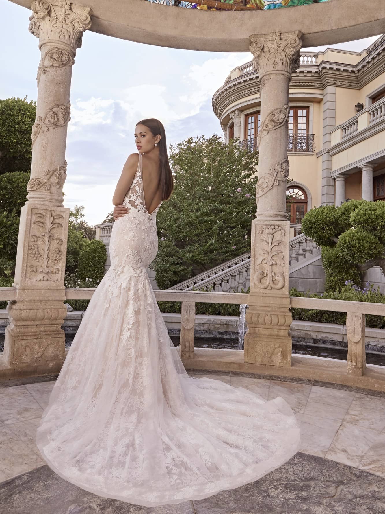 The Casablanca Plus-Size Fit-and-Flare Wedding Dress is the epitome of romantic elegance and timeless design, making it the perfect choice for San Diego brides seeking a gown that combines sophistication with sexy charm. Featuring intricate lace detailing, a plunge neckline, and a beautifully crafted V-back, this gown is designed to showcase the bride’s natural curves while still offering a sense of modesty and refinement. The fit-and-flare silhouette is universally flattering, hugging the bride’s body at the waist and hips before gently flaring out, creating a figure-enhancing shape that provides both comfort and style.
