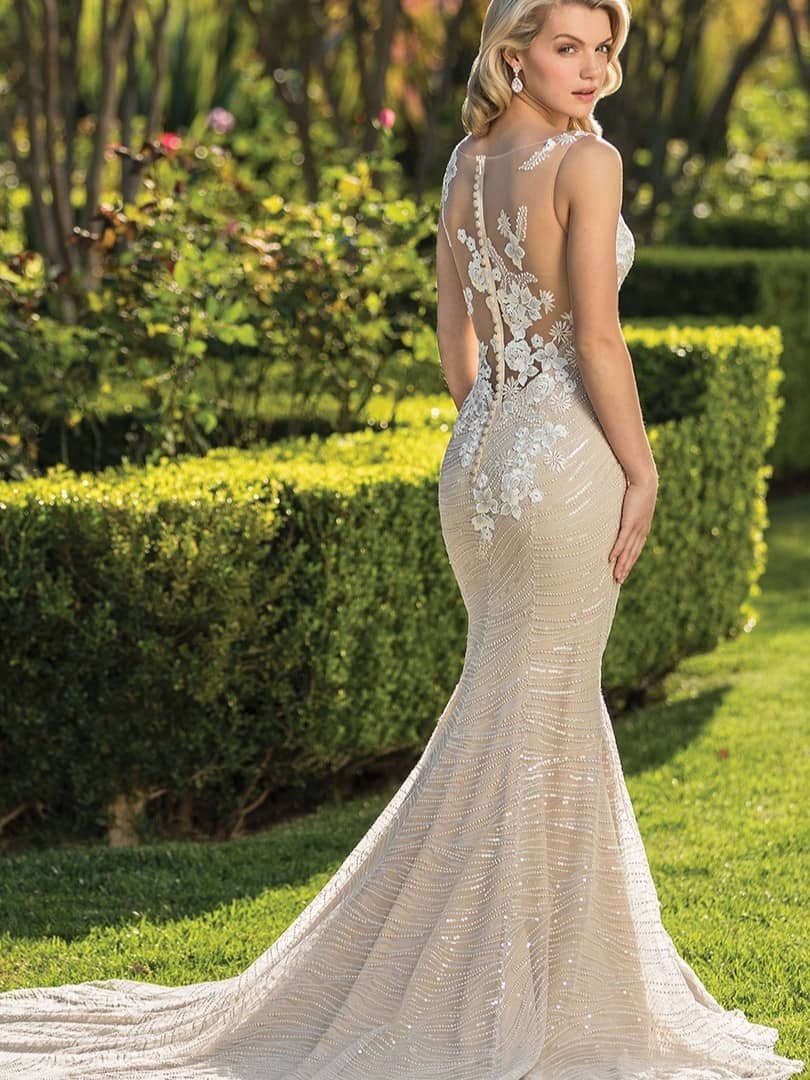 The Casablanca Fit-and-Flare Wedding Dress is a popular choice for San Diego brides because it combines timeless romance with modern elements. The lace detailing gives the dress a classic, elegant look, while the illusion back adds a contemporary touch that makes it stand out from other wedding dresses. The bateau neckline and low back add a sense of sophistication, creating a bridal look that is both refined and sensual.
