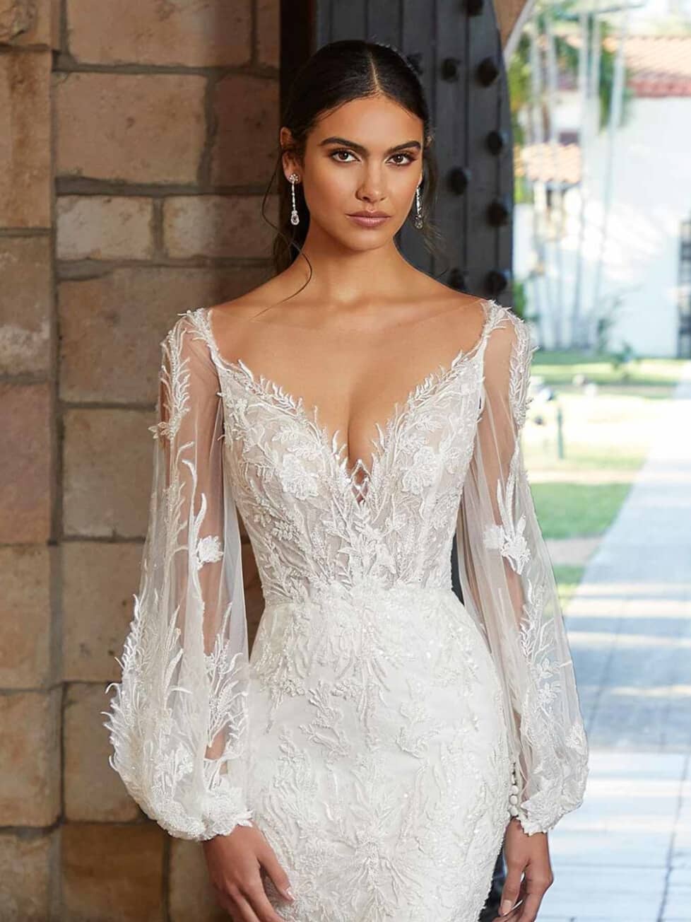 Illusion lace sleeves offer coverage with a hint of seduction, while deep V-necks elongate the body and flatter the neckline—ideal for brides looking for refined sex appeal.
