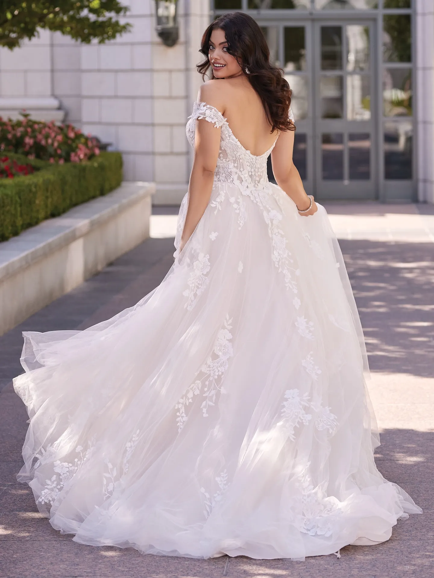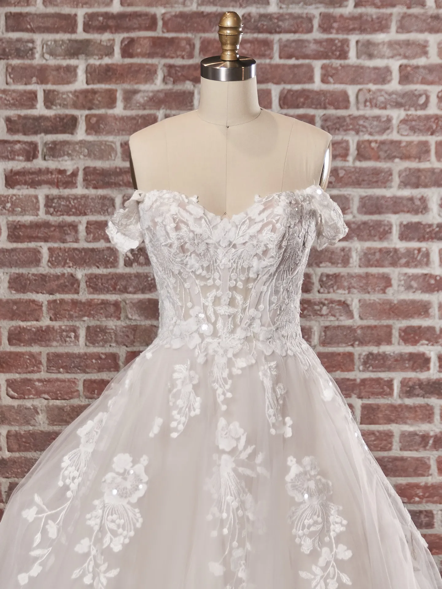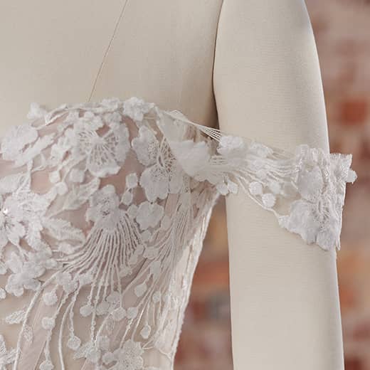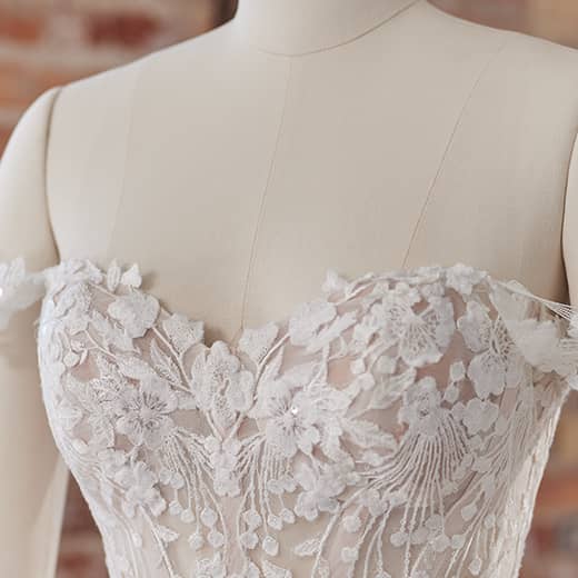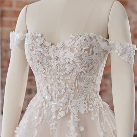 The off-shoulder sweetheart neckline is a timeless bridal design that is both flattering and romantic. The sweetheart neckline enhances the bride’s natural shape, while the off-shoulder design adds a touch of elegance and femininity. The Maggie Sottero lace ball gown beautifully combines these features with lace detailing and tulle, creating a look that is both sophisticated and dreamy. This romantic design is perfect for San Diego brides who want to feel graceful and chic on their wedding day.