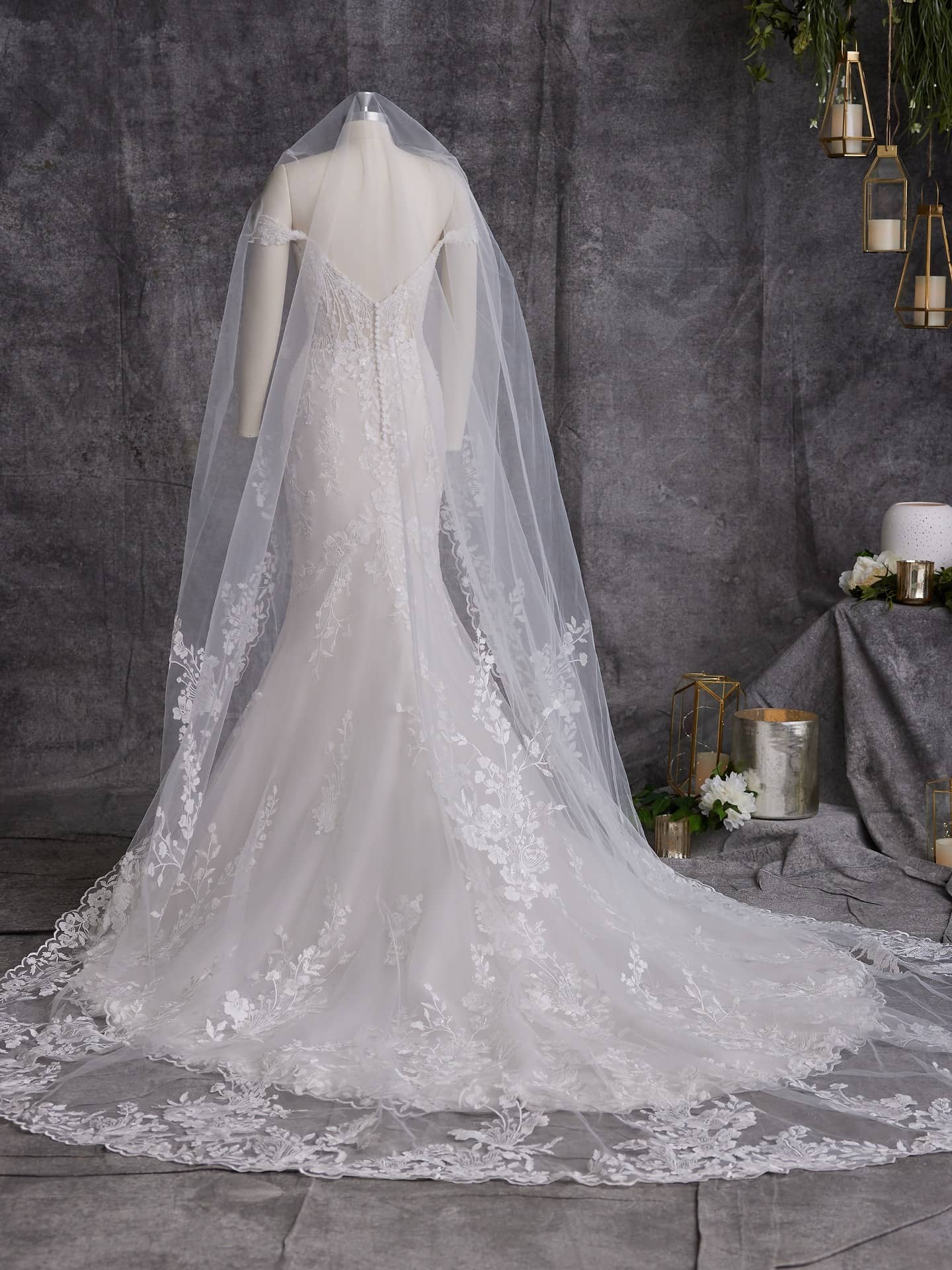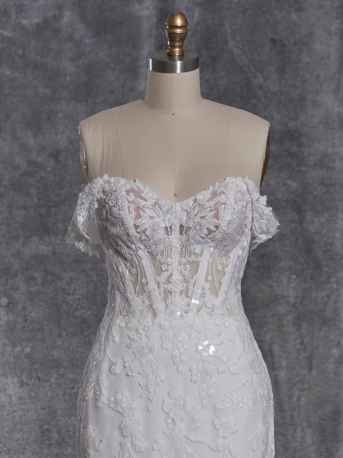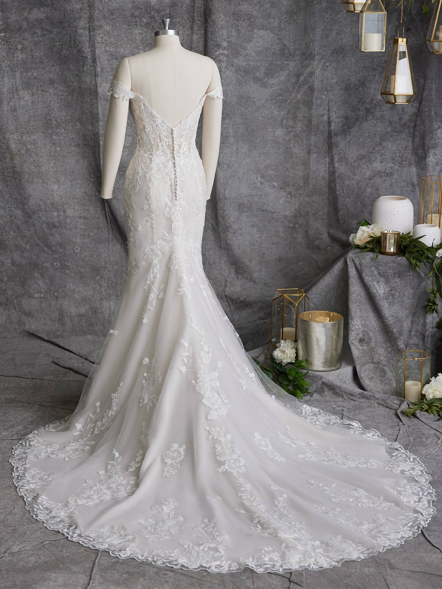 At Bridal and Tuxedo Galleria, we offer a curated selection of Maggie Sottero wedding gowns, including the lace sheath gown. Known for their luxurious designs and impeccable craftsmanship, Maggie Sottero gowns provide brides with the perfect blend of sophistication and modern appeal. The sheath silhouette of this gown offers a sleek, fitted look that flatters every body type. The lace detailing adds a touch of romance, while the off-shoulder sweetheart neckline gives it a graceful, classic appearance. The gown’s V-back and cap sleeves provide a modern yet timeless style that works beautifully for San Diego brides who want both elegance and comfort. Available in our sample sale, brides can experience the luxury of a designer gown at a fantastic price.
