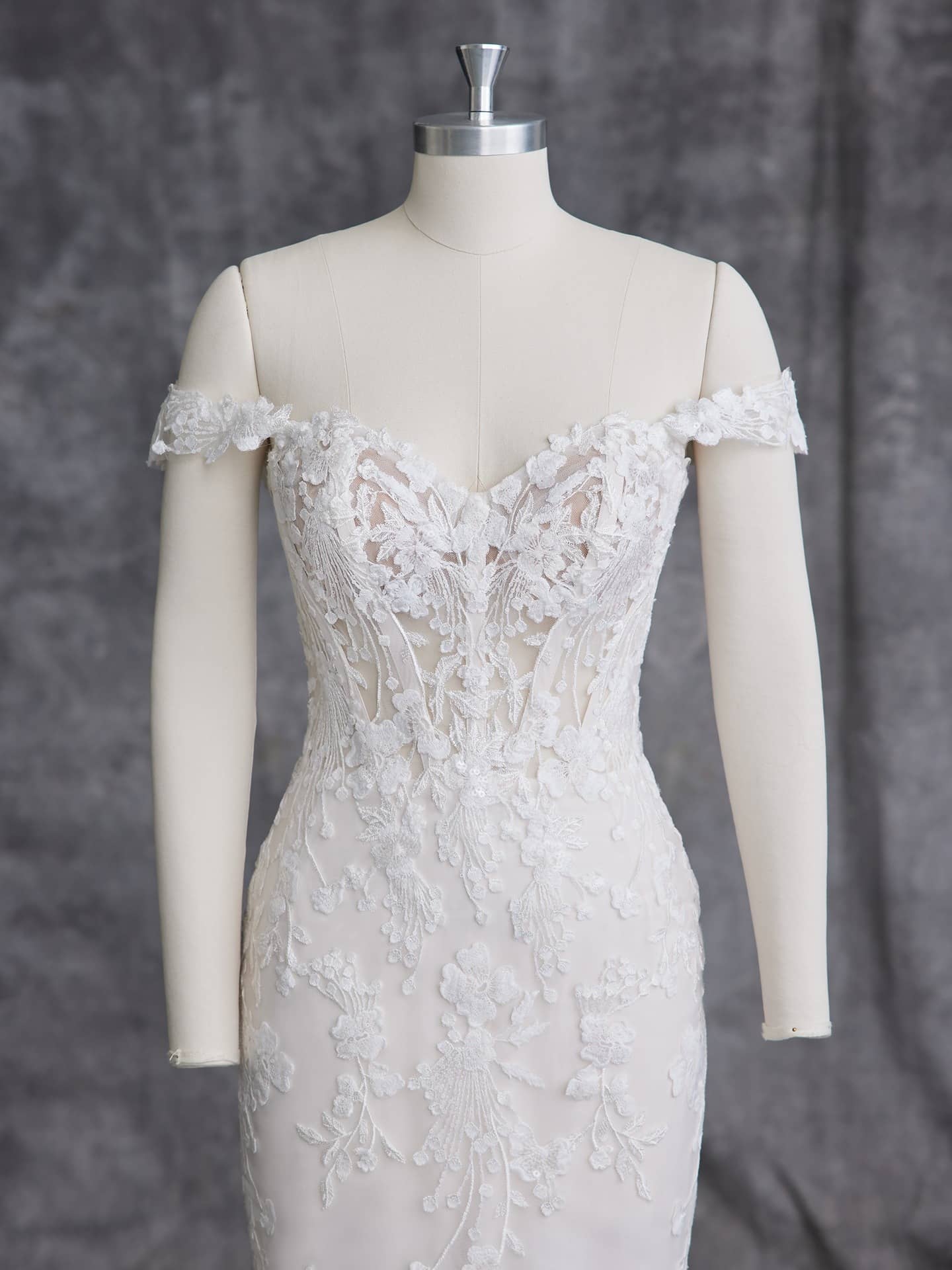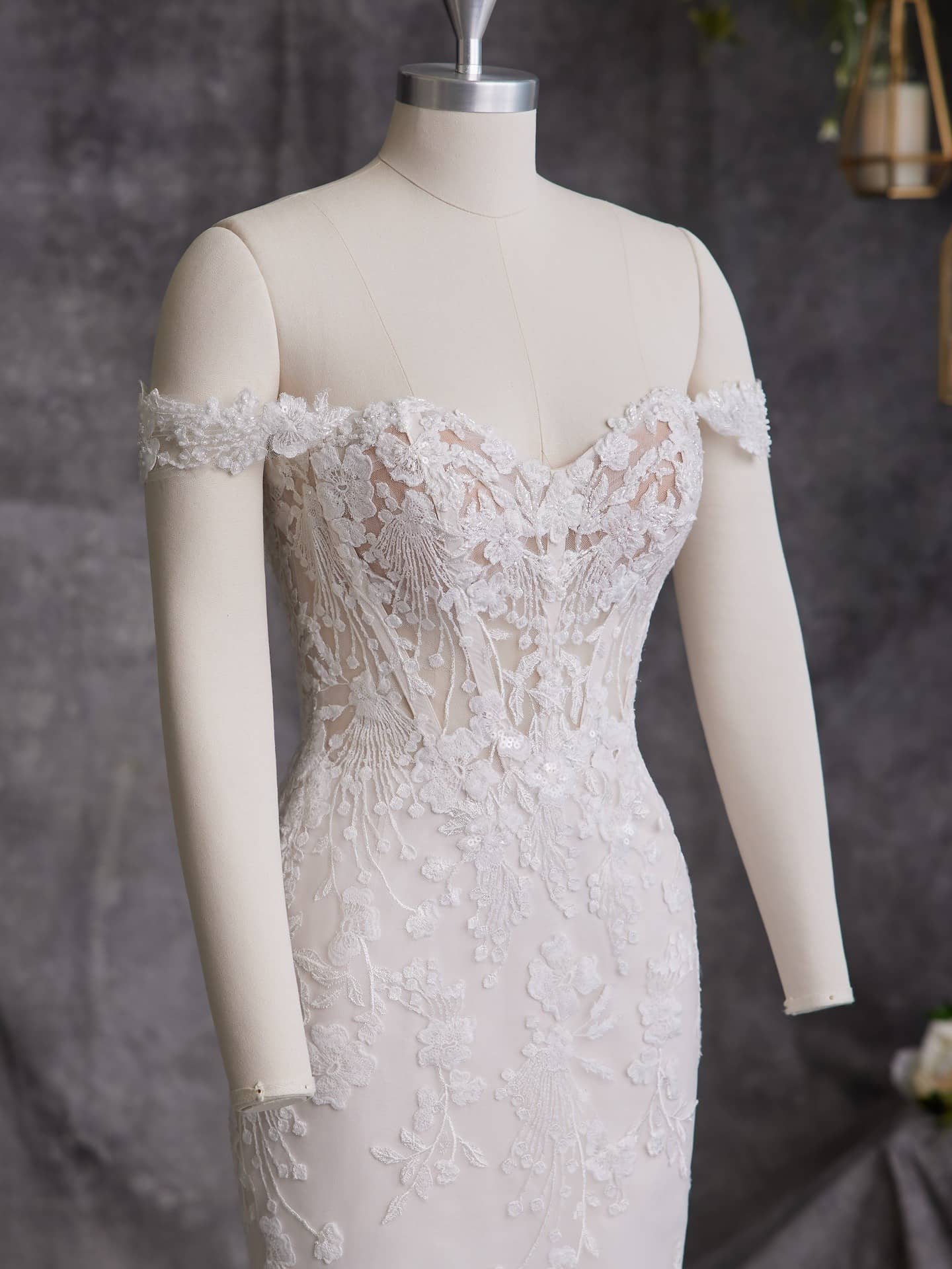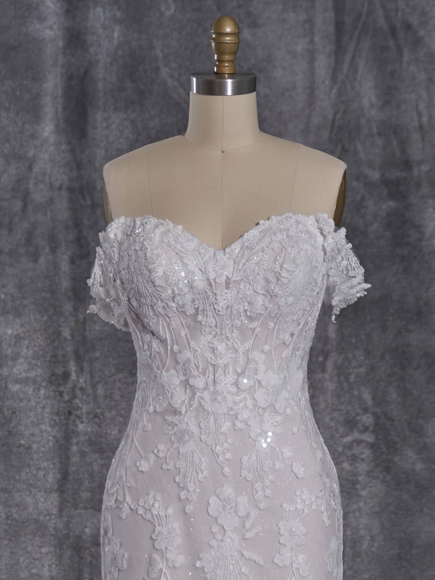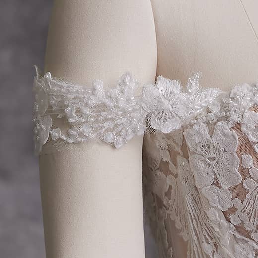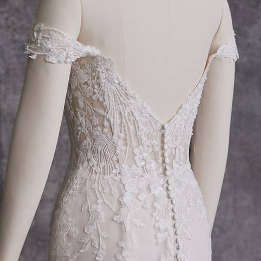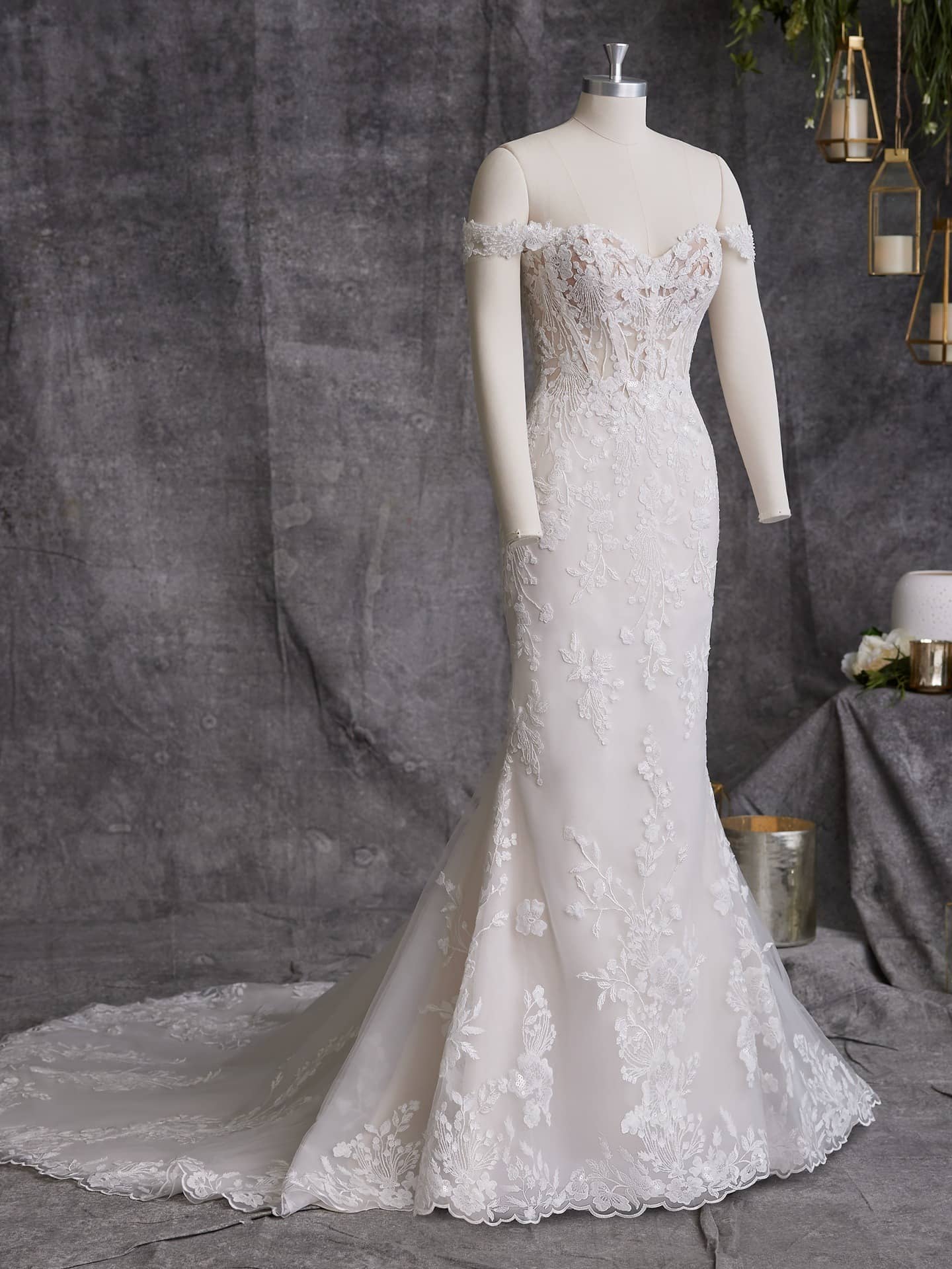 The Maggie Sottero Lace Sheath Wedding Dress is an ideal choice for San Diego brides who desire a blend of timeless romance and modern sophistication. Featuring intricate lace detailing, this gown exudes classic beauty while offering a contemporary fit with its sheath silhouette. The off-shoulder sweetheart neckline adds a feminine touch that beautifully frames the face and collarbones, while the V-back creates a modern twist. The tulle fabric enhances the gown’s ethereal feel, making it perfect for both formal and intimate weddings in San Diego. The cap sleeves offer just the right amount of coverage, allowing brides to feel both elegant and comfortable on their special day. Whether you’re celebrating in a grand ballroom or at a coastal venue, this gown ensures you look and feel magnificent.