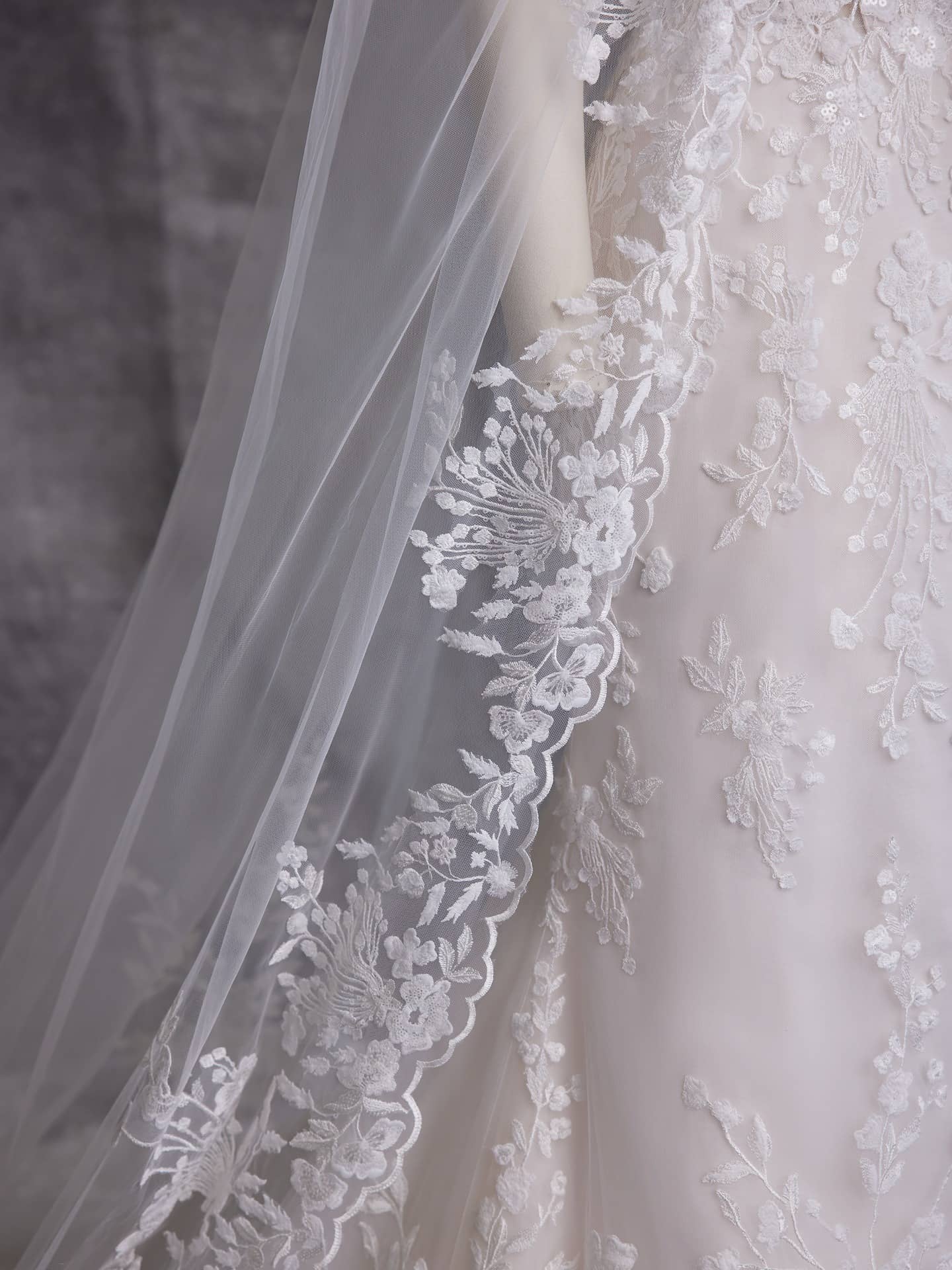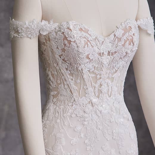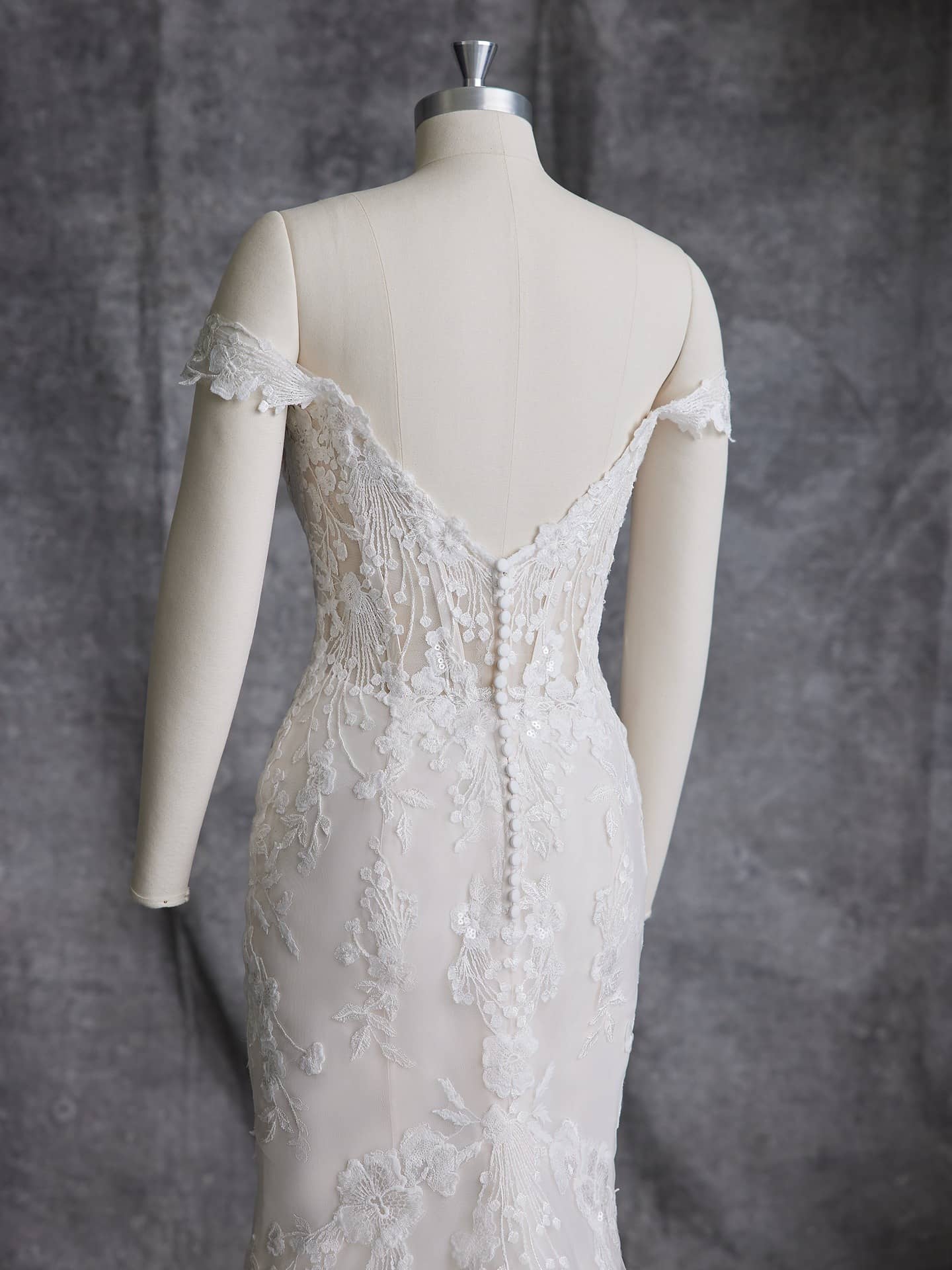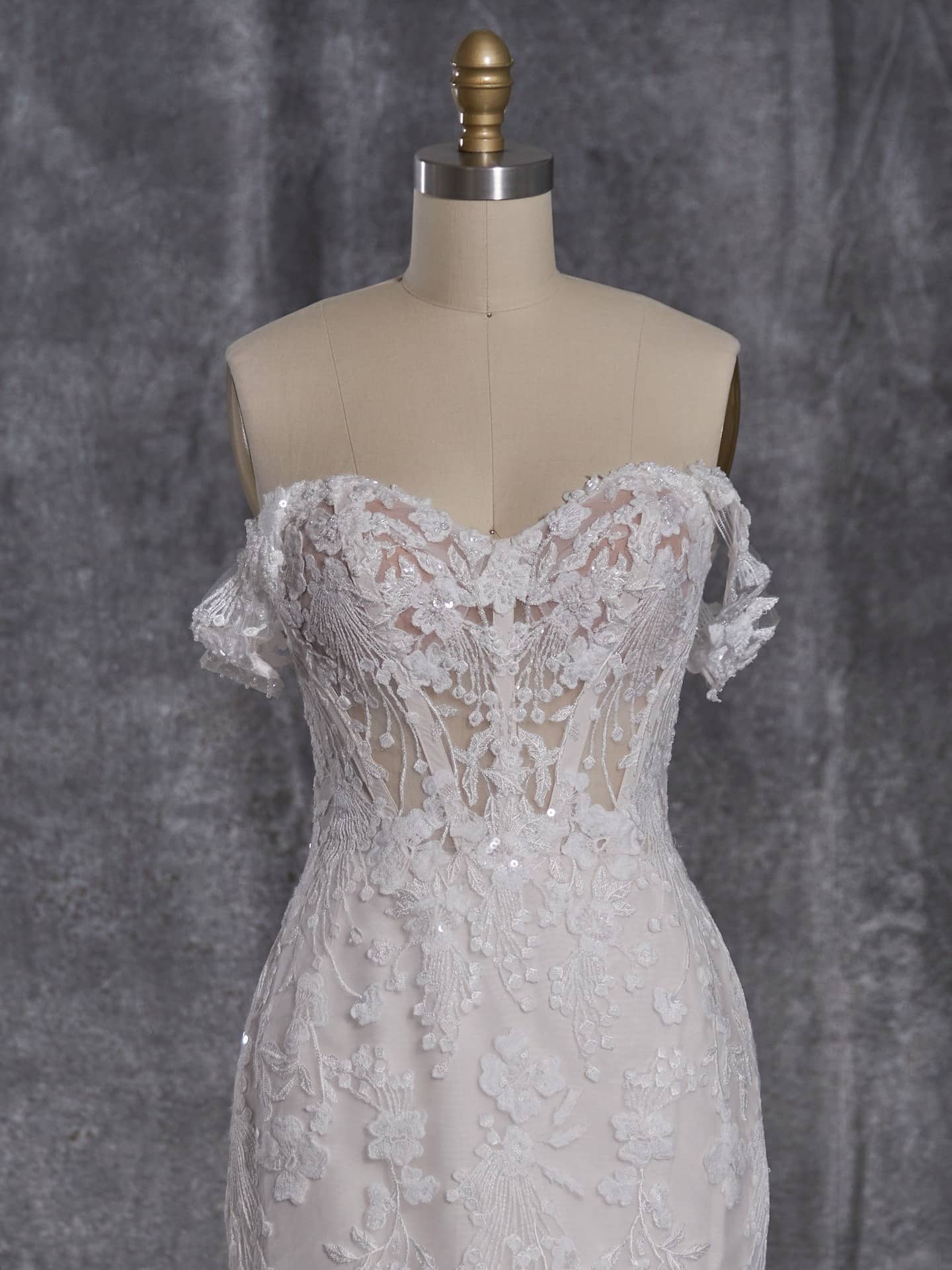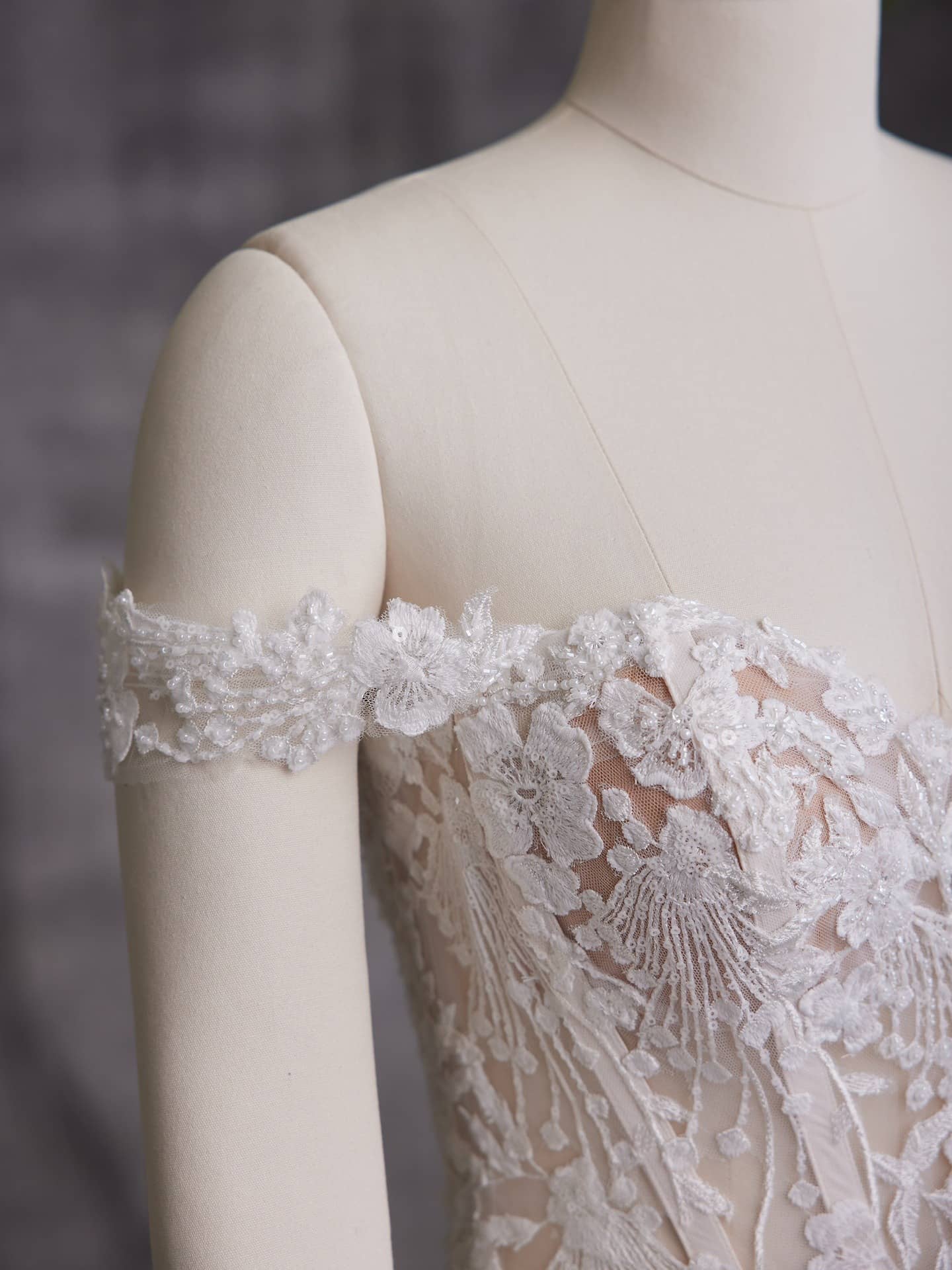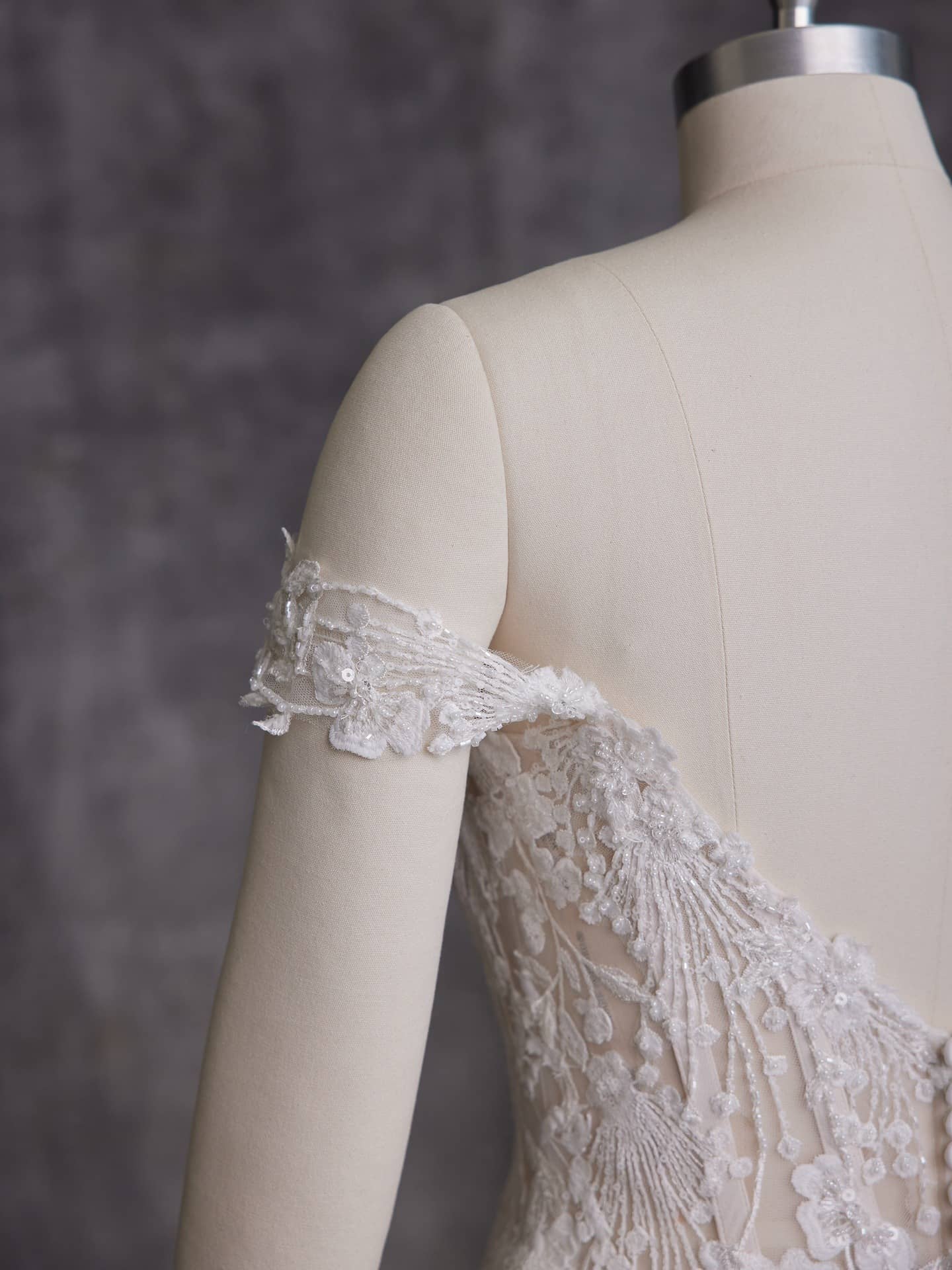 The Maggie Sottero Lace Sheath Wedding Dress is an ideal choice for San Diego brides who desire a blend of timeless romance and modern sophistication. Featuring intricate lace detailing, this gown exudes classic beauty while offering a contemporary fit with its sheath silhouette. The off-shoulder sweetheart neckline adds a feminine touch that beautifully frames the face and collarbones, while the V-back creates a modern twist. The tulle fabric enhances the gown’s ethereal feel, making it perfect for both formal and intimate weddings in San Diego. The cap sleeves offer just the right amount of coverage, allowing brides to feel both elegant and comfortable on their special day. Whether you’re celebrating in a grand ballroom or at a coastal venue, this gown ensures you look and feel magnificent.