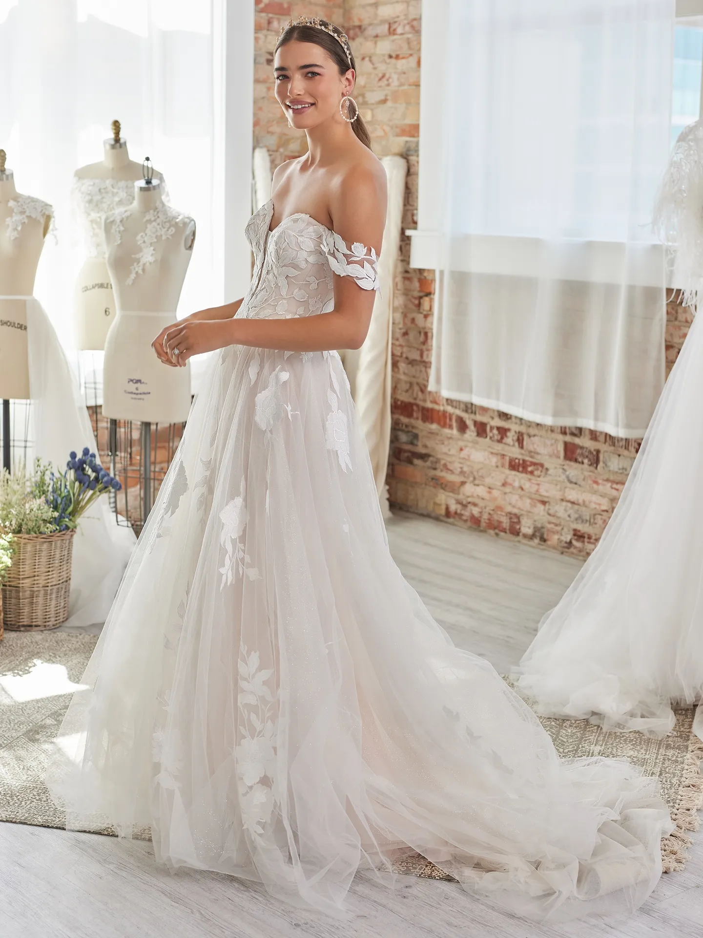 This stunning gown features delicate lace and tulle, creating a dreamy silhouette that flatters every figure. With cap sleeves and a scoop back, it blends modern trends with classic bridal charm — a popular choice among brides looking for affordable wedding gowns in San Diego without compromising on quality or style.
