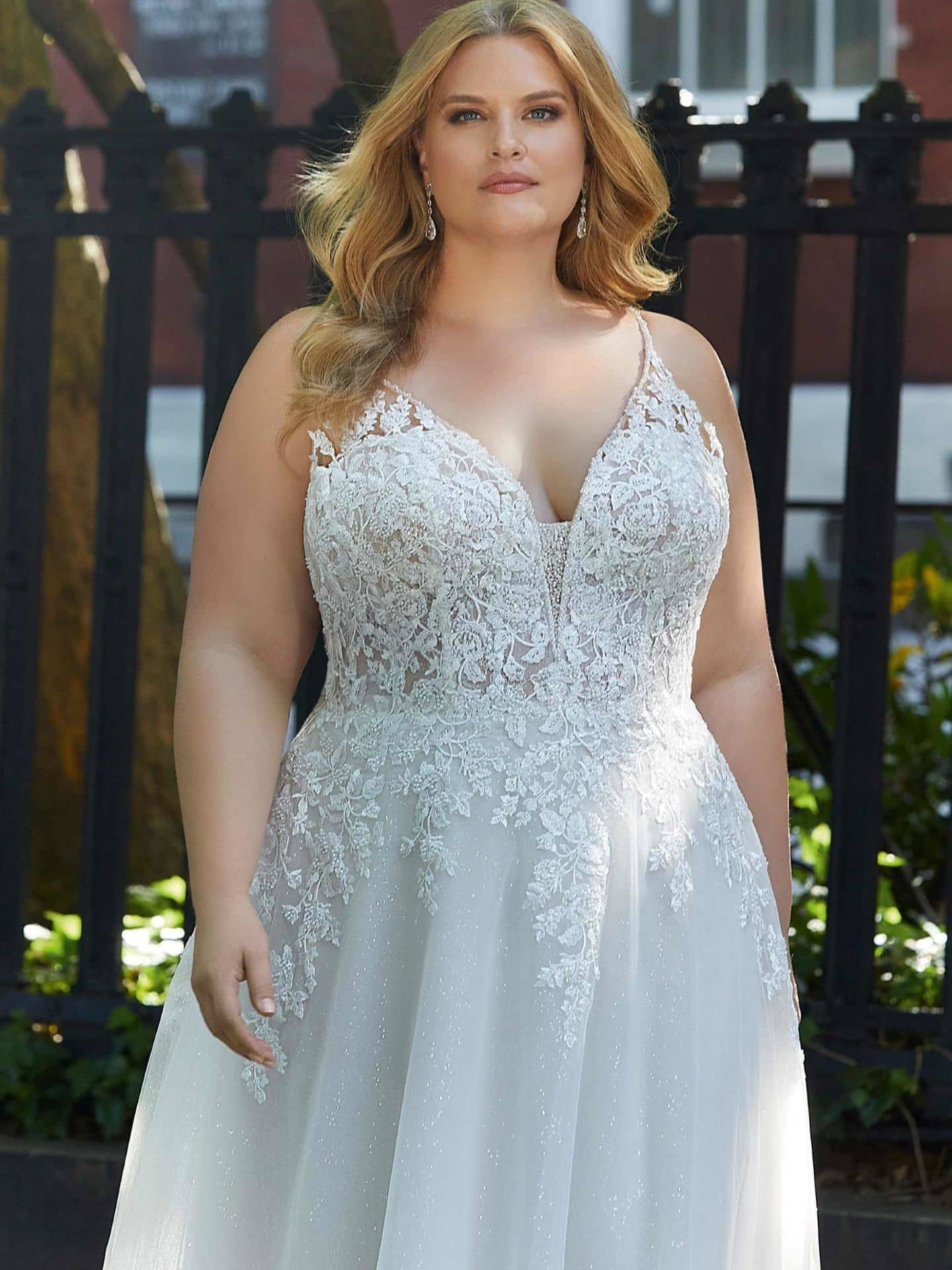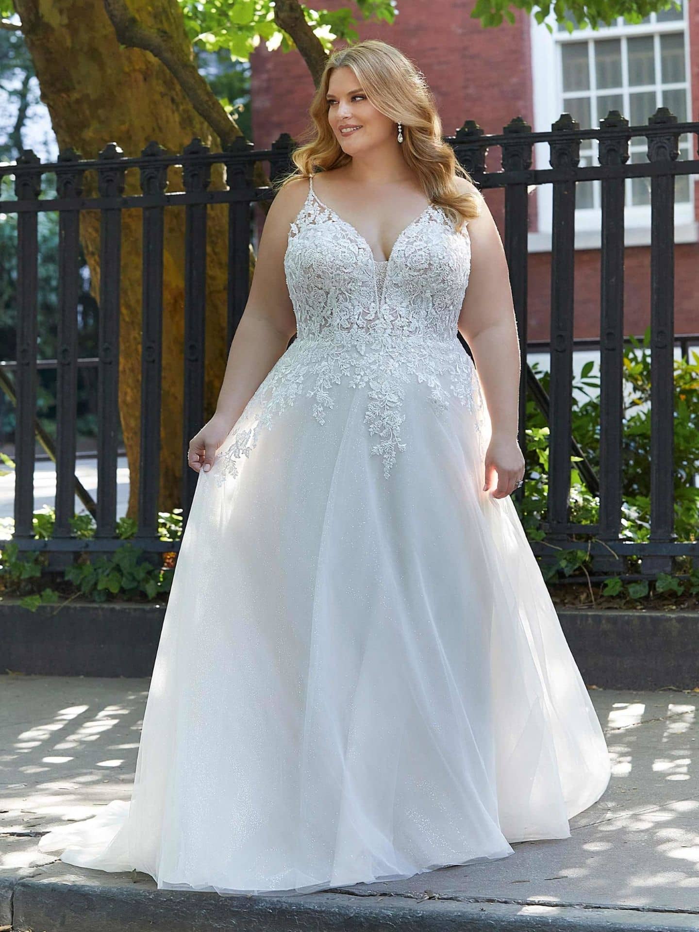 What sets our A-Line dresses apart is the perfect combination of structure and flow. The A-line silhouette is flattering on all body types, including our Morilee plus-size bridal gowns, which are tailored to enhance natural curves while offering supportive design through adjustable straps and built-in corsetry. Many of our styles feature V-neck or sweetheart necklines, delivering the perfect balance of modesty and allure. Brides who shop with us also appreciate the delicate lace appliqués, which add a romantic, ethereal feel to their bridal look.