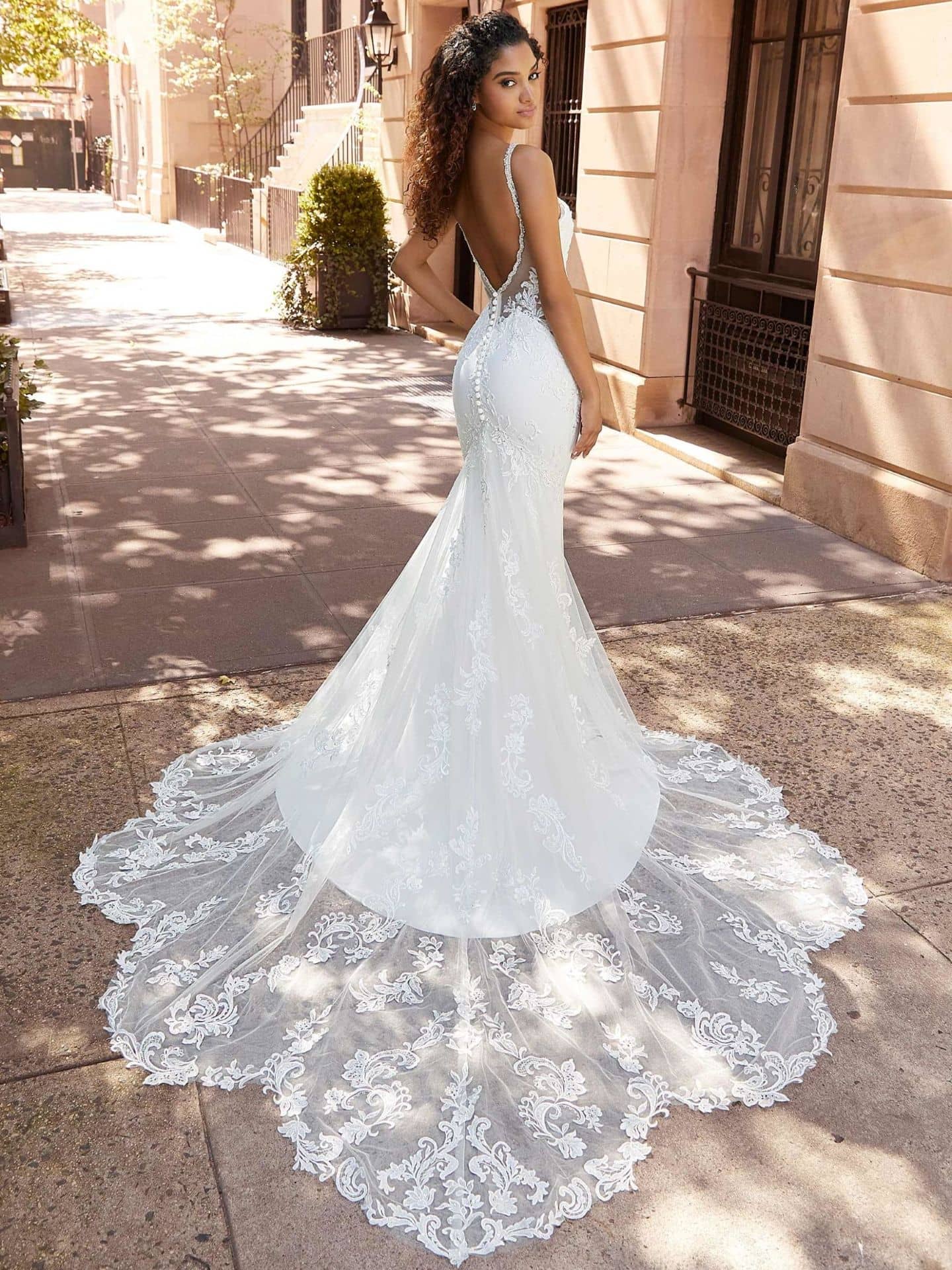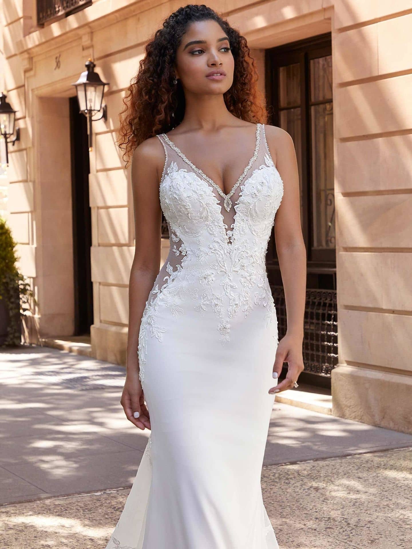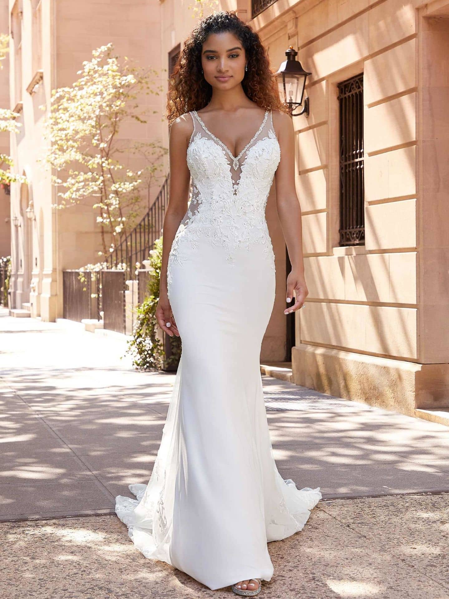 There’s a fine line between sultry and sophisticated, and Morilee walks it flawlessly with its plunge neckline and V-neck wedding gowns. These designs have become top picks for brides in San Diego looking for a sexy wedding dress that still feels bridal and refined. Bridal and Tuxedo Galleria offers exclusive access to Morilee’s latest drops, ensuring you’ll find a fit-and-flare gown with plunging elegance that turns heads while staying true to your personal style.