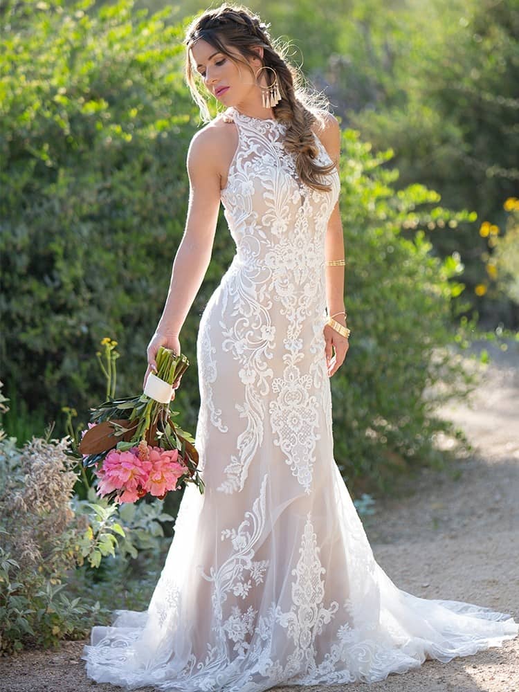 The Casablanca Fit-and-Flare Wedding Dress stands out in the San Diego bridal market due to its timeless design combined with modern touches that make it both classy and sexy. The halter neckline adds a unique and elegant element, offering modest coverage while still showcasing the shoulders and neck. The keyhole back offers a surprising touch of sensuality, providing a glimpse of skin in a classy way that remains both modest and sophisticated. The lace detail throughout the bodice adds a vintage-inspired charm, ensuring that this dress is as romantic as it is stylish.