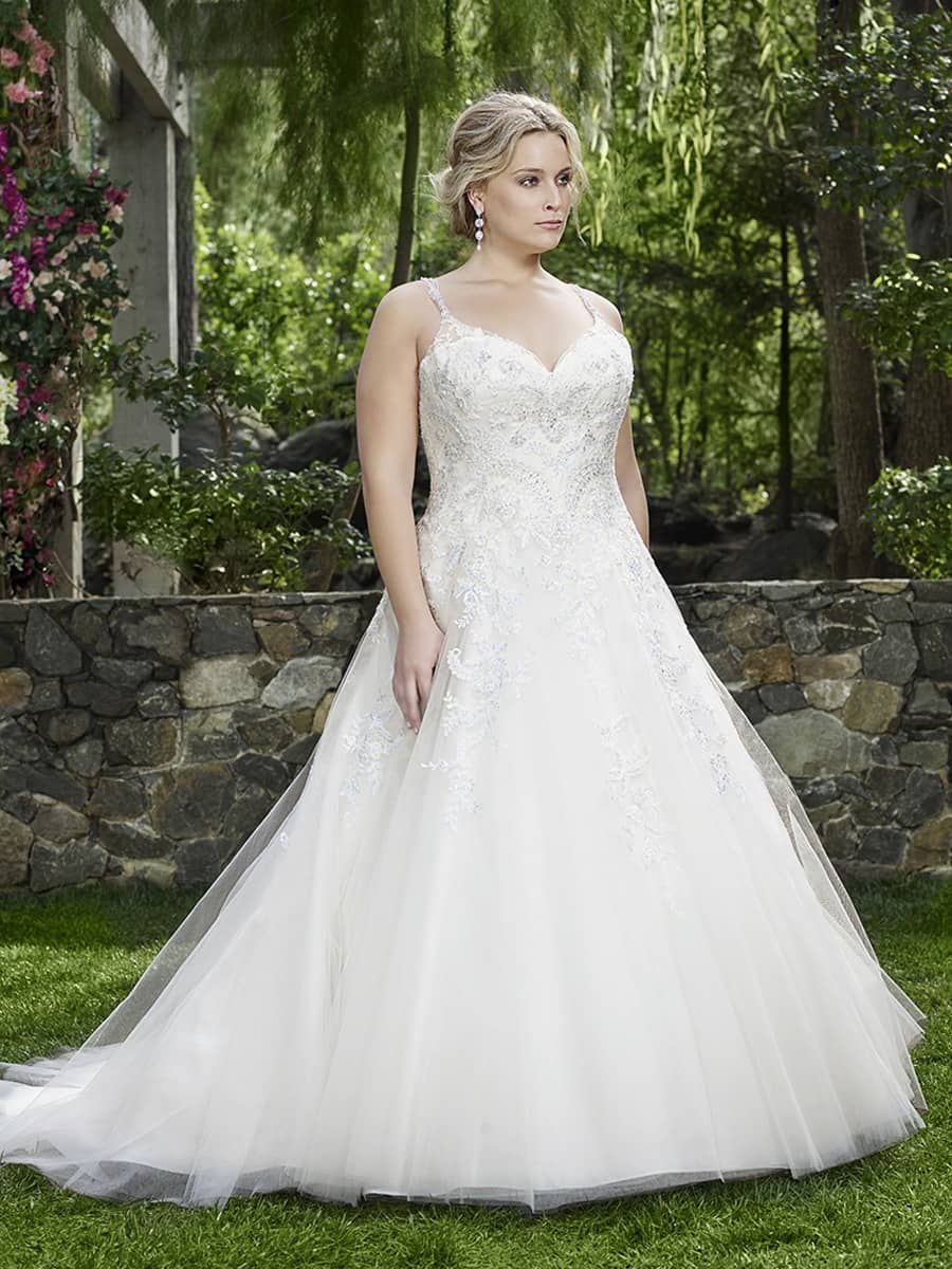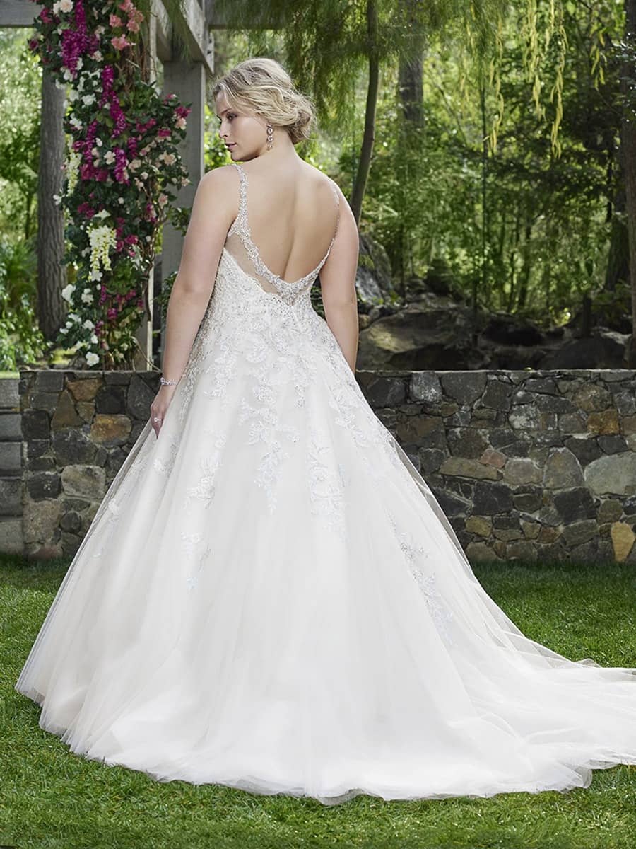 The V-neck, scoop back, and tulle skirt are design elements that make Casablanca Bridal’s plus-size ball gown wedding dresses both flattering and modern. The V-neckline elongates the bride’s torso and enhances the bust, creating a balanced and flattering silhouette that works beautifully for plus-size brides. The scoop back adds a touch of sophistication, providing just the right amount of coverage while creating a sleek, elegant look from the back. The tulle skirt adds volume and movement, making it a perfect choice for brides who want a dramatic yet graceful appearance on their wedding day.