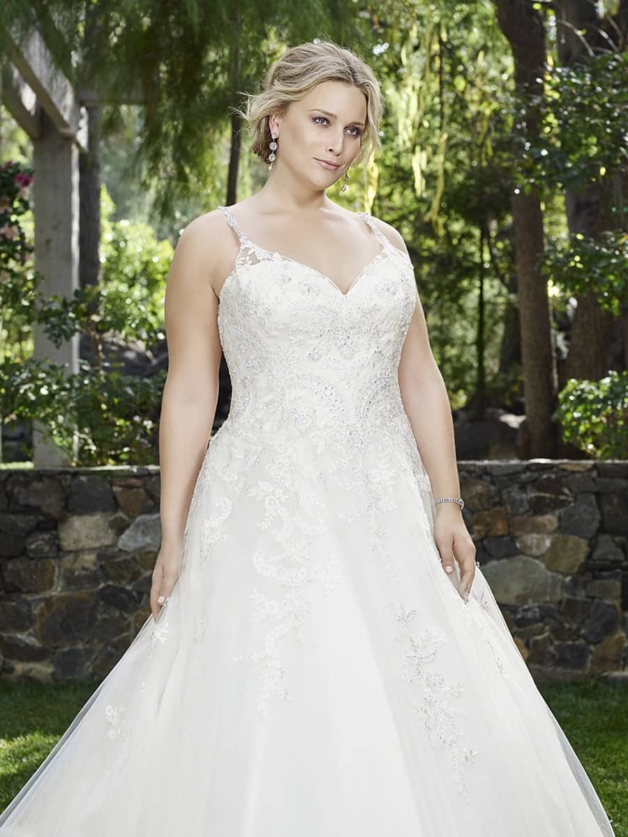 Explore Casablanca Plus-Size Ball Gown Wedding Dresses in San Diego – Romantic Lace & Satin Gowns with V-Neck, Scoop Back & Tulle Skirt