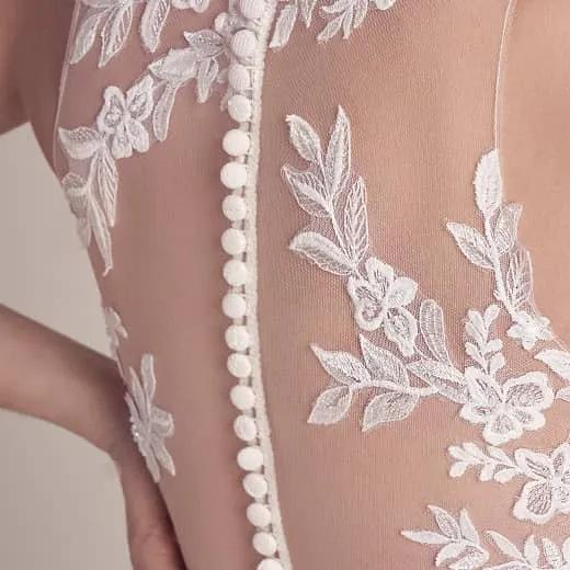 The Maggie Sottero Lace Fit-and-Flare Wedding Dress is the perfect blend of boho charm and classic elegance, making it an ideal choice for San Diego brides who want to look stunning without compromising comfort. Featuring intricate lace detailing, the gown exudes a timeless appeal while the fit-and-flare silhouette flatters the bride’s natural curves. The strapless sweetheart neckline provides a feminine and romantic look, while the tulle fabric adds a soft, airy feel that moves gracefully throughout the day. The gown’s flattering fit makes it perfect for both formal weddings and relaxed outdoor ceremonies in San Diego, giving the bride a chic and elegant appearance. Whether you’re planning a beachside ceremony or a garden wedding, this gown will help you shine.