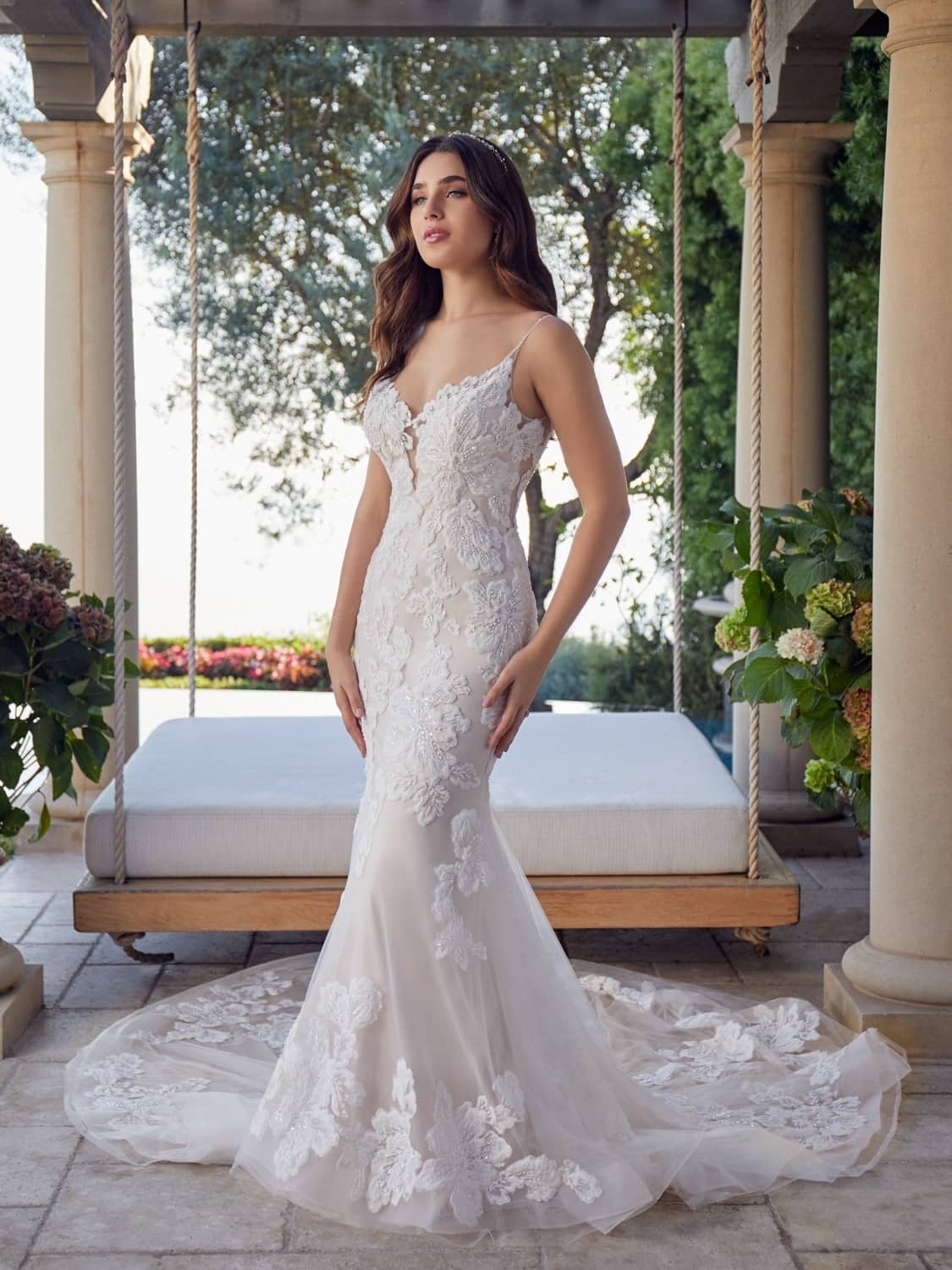 Unlike many competitors in San Diego, who focus on off-the-rack dresses with limited personalization, Bridal and Tuxedo Galleria specializes in offering tailored fittings and custom alterations to ensure the Casablanca Fit-and-Flare Wedding Dress is adjusted to perfectly suit each bride’s unique body shape. The fit-and-flare silhouette is universally flattering, especially for plus-size brides, enhancing their figure while providing ample freedom to move comfortably throughout the day. With the addition of straps and the V-neckline, this gown offers an added modern touch while maintaining its romantic charm, making it an ideal choice for both formal ballroom weddings and outdoor ceremonies in San Diego’s beautiful climate.