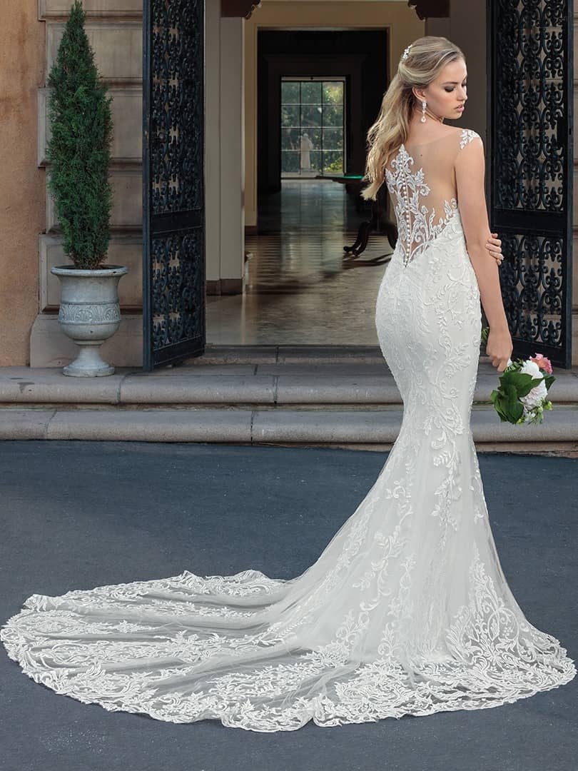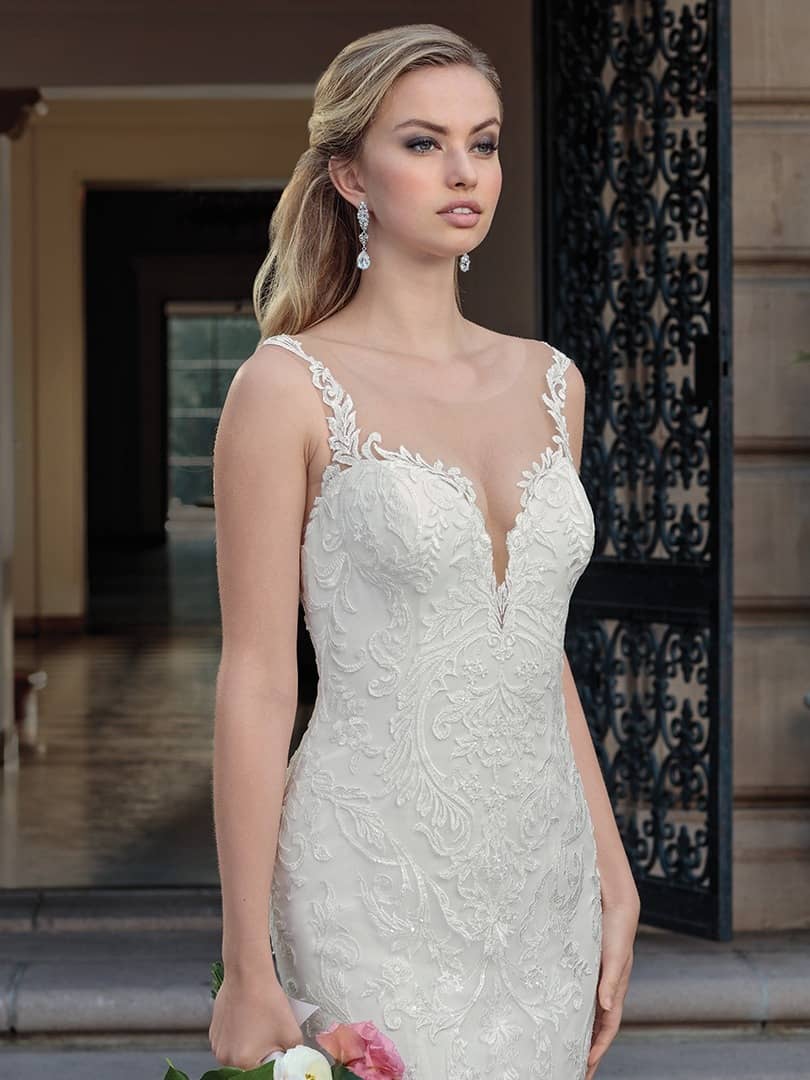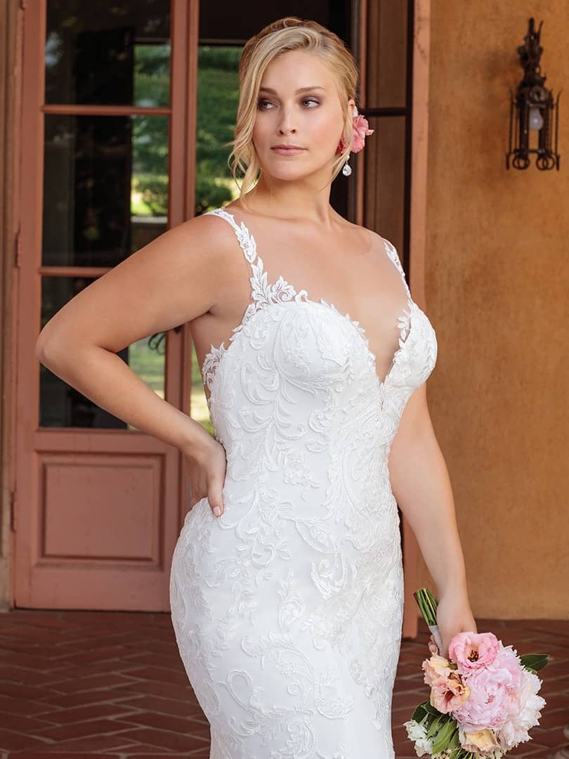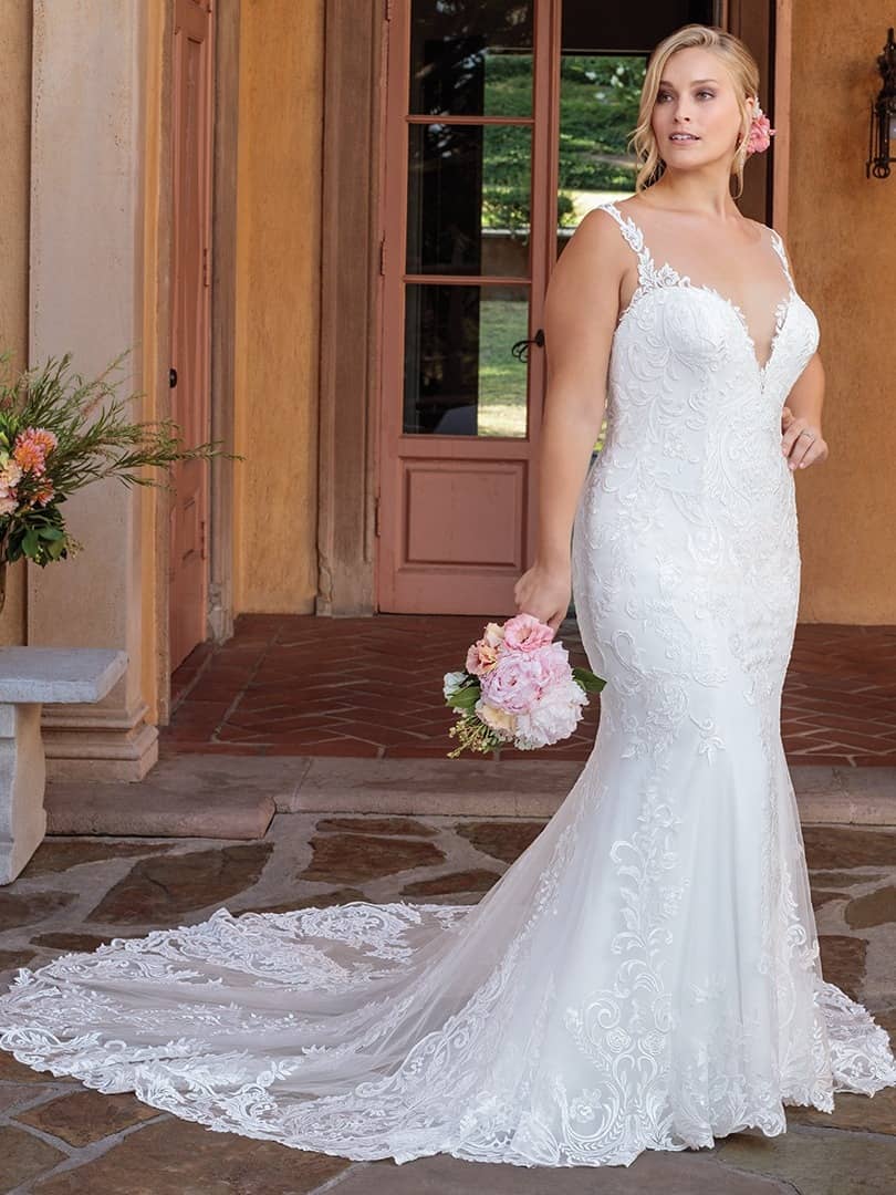 When searching for the perfect wedding dress in San Diego, the Casablanca Fit-and-Flare wedding dress stands out as a top choice for brides seeking an elegant and romantic gown that flatters all body types. This stunning dress is designed with intricate lace details, a flattering plunge neckline, and an elegant illusion back that gives it a modern yet timeless appeal. With a focus on both beauty and comfort, the Casablanca Plus-Size wedding gown ensures brides feel confident and radiant as they walk down the aisle.