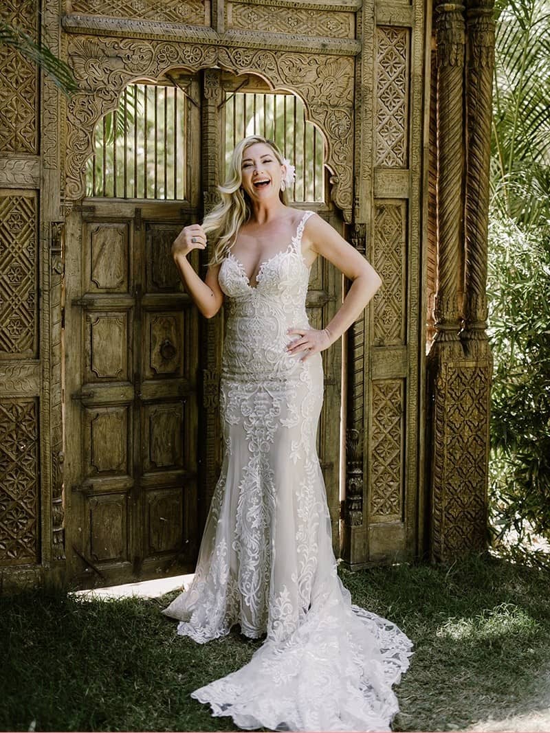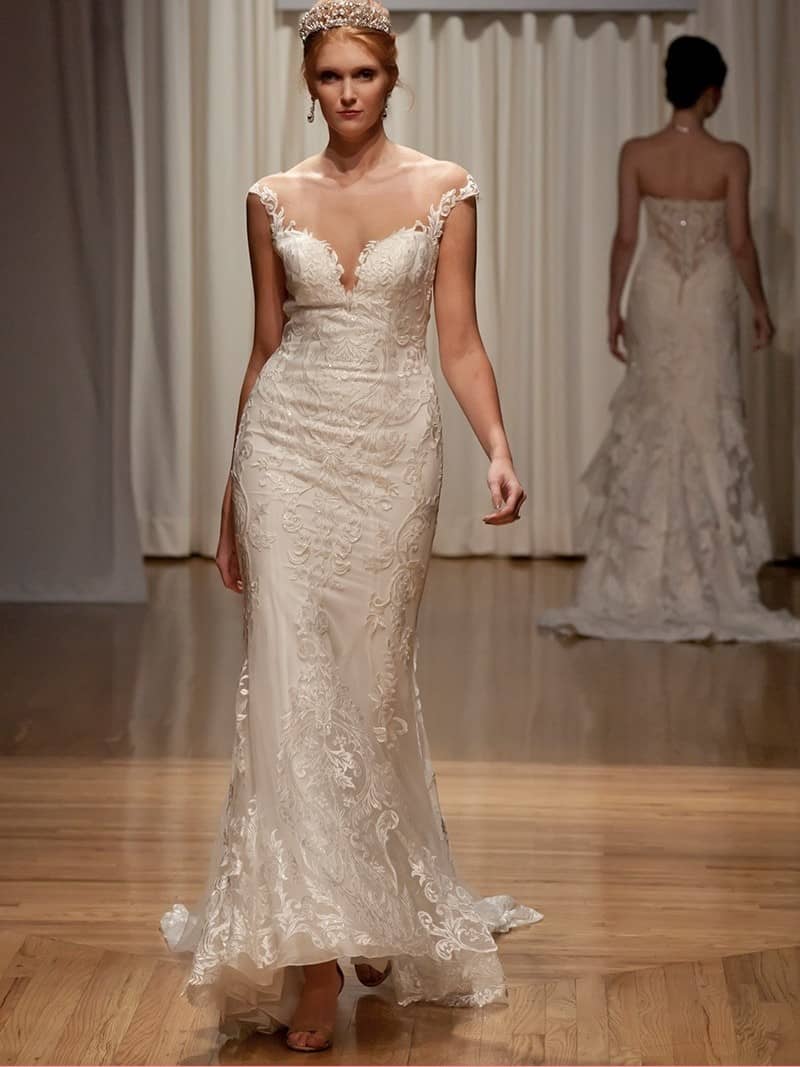 San Diego brides who want a wedding dress that combines classic elegance with modern details choose the Casablanca Fit-and-Flare gown for its flattering fit and romantic style. The gown’s lace detailing, illusion back, and plunge neckline make it an unforgettable choice for brides looking to stand out on their wedding day. The fit-and-flare silhouette enhances the bride’s natural shape while providing comfort and ease of movement, making it ideal for dancing and enjoying the celebration.