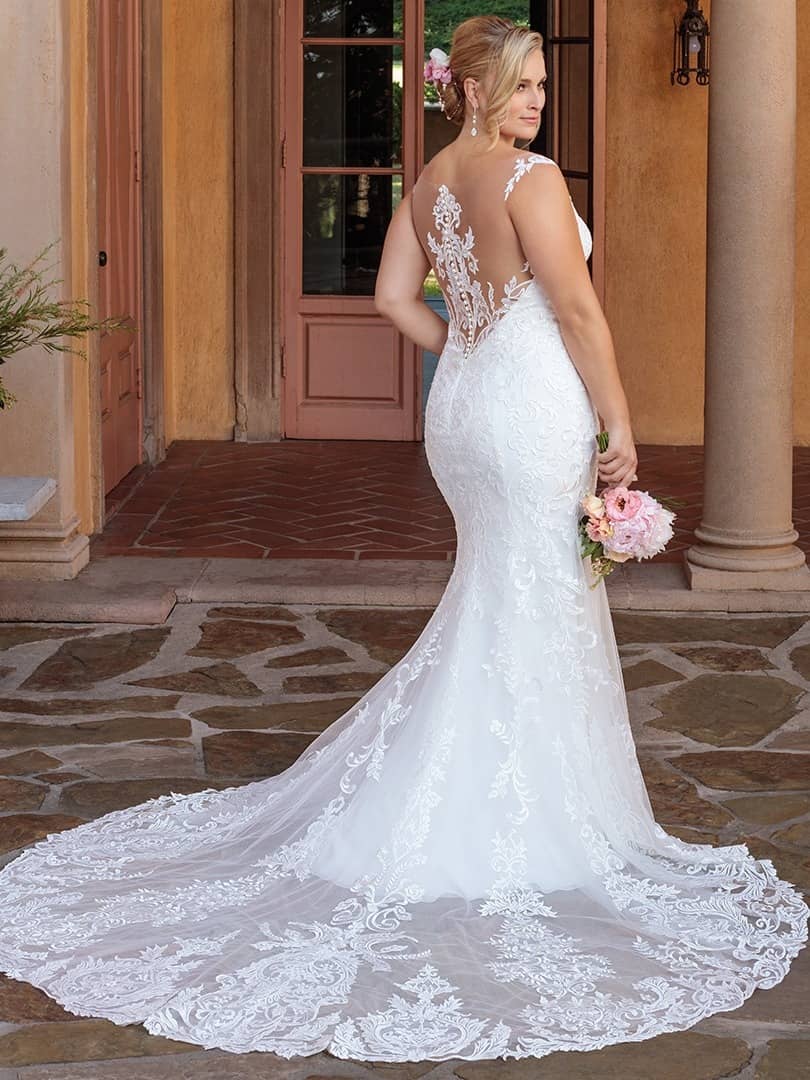 Bridal and Tuxedo Galleria’s exclusive selection of Casablanca wedding dresses in San Diego is designed to stand out. Many bridal shops in the area may carry standard lace gowns, but this dress incorporates a unique combination of features, including the plunge neckline, the illusion back, and the plus-size fit, making it a top choice for brides who want something both elegant and modern. The gown’s fit-and-flare silhouette is incredibly versatile, flattering a variety of body types and offering a style that works for both classic and contemporary weddings.