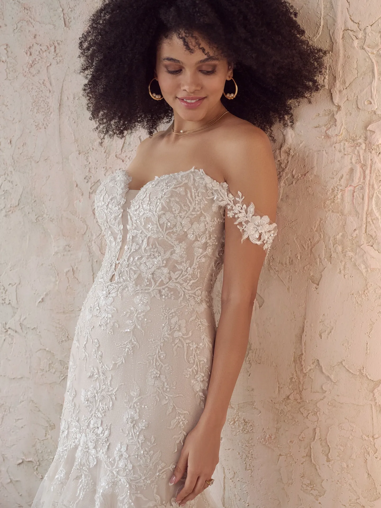 The Maggie Sottero Mermaid Lace Wedding Dress is the perfect blend of modern sophistication and timeless romance, making it a favorite among San Diego brides. The mermaid silhouette beautifully hugs the body from the torso down to the knees before flaring out, creating an hourglass figure that is both flattering and bold. Featuring intricate lace detailing, the gown exudes romance while maintaining a chic, sexy look. The off-shoulder sweetheart neckline adds a feminine touch, elongating the neck and accentuating the bride’s collarbones, while the scoop back provides a modern and elegant twist. The soft tulle fabric gives the gown an ethereal feel, making it perfect for San Diego beach weddings or more formal celebrations. Whether you’re hosting a grand event or a more intimate gathering, this gown ensures you look stunning from every angle.