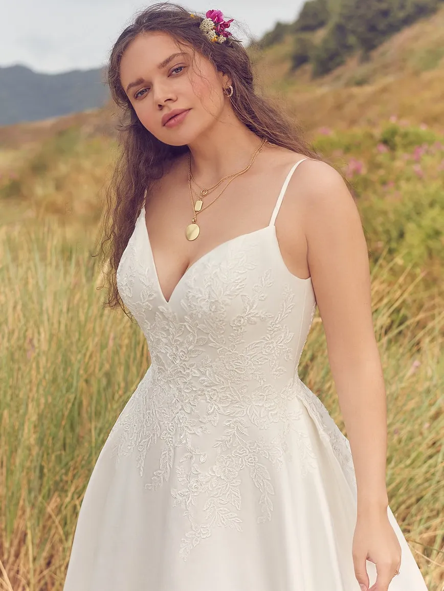 Rebecca Ingram wedding dresses are known for their sophisticated designs, superior craftsmanship, and timeless appeal. The Mikado satin used in this gown gives it a rich, luxurious finish while maintaining a level of comfort that’s essential for your special day. The ball gown silhouette is a classic choice for brides who want volume and elegance, while the straps provide additional comfort and support. This gown blends traditional beauty with modern elements, making it a perfect choice for San Diego brides looking for something both stunning and comfortable. With the sample sale price, you can indulge in a designer gown at an affordable cost, making your dream wedding dress a reality.