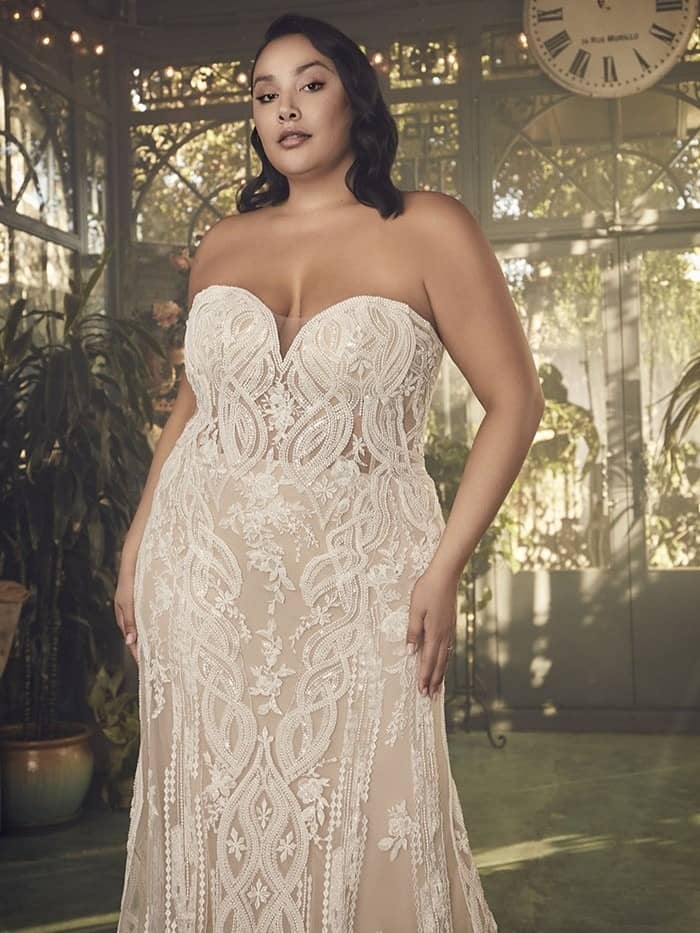 The Casablanca Plus-Size Fit-and-Flare Wedding Dress is the perfect choice for San Diego brides seeking a blend of romantic elegance and modern sophistication. This dress features romantic lace detailing, a flattering strapless sweetheart neckline, and a beautiful scoop back, creating a timeless bridal look that is both graceful and sexy. The fit-and-flare silhouette enhances the bride’s natural curves, offering a figure-flattering design that is perfect for brides of all shapes and sizes, particularly plus-size brides who want a gown that is both elegant and comfortable.