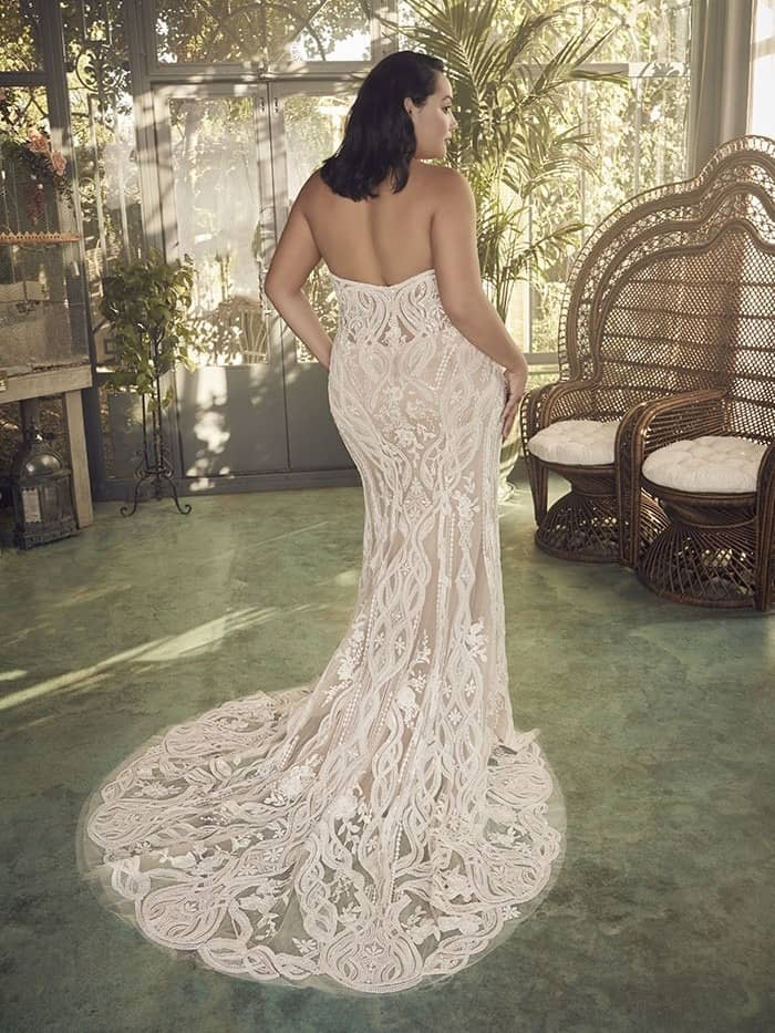 The sweetheart neckline offers a feminine touch while drawing attention to the bride’s face and collarbones. The strapless design ensures that the Casablanca Plus-Size Fit-and-Flare Wedding Dress offers support and structure, allowing the bride to feel secure while still showcasing her natural beauty. The scoop back adds an elegant yet sensual touch, showing just enough skin without compromising the overall elegance of the gown. The fit-and-flare style also makes the gown comfortable for a variety of venues, whether it’s a grand ballroom or a more casual garden wedding.