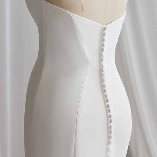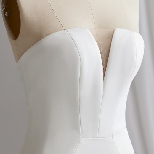 Brides dreaming of a figure-hugging mermaid wedding dress in San Diego will fall in love with the Rebecca Ingram Fit-and-Flare gown. With its sleek satin fabric, dramatic V-neckline, and sophisticated strapless silhouette, this gown combines modern glamour with timeless bridal elegance.