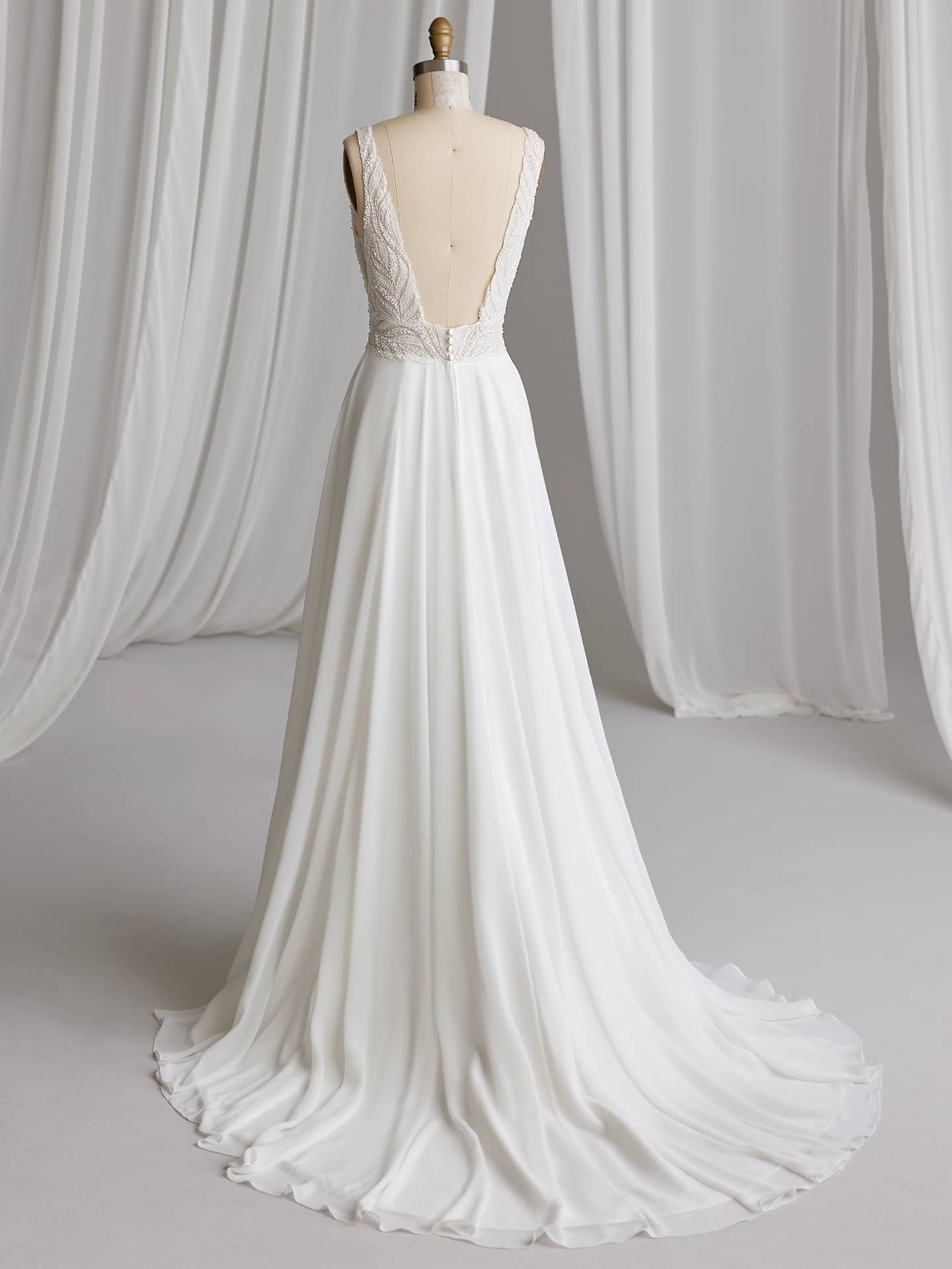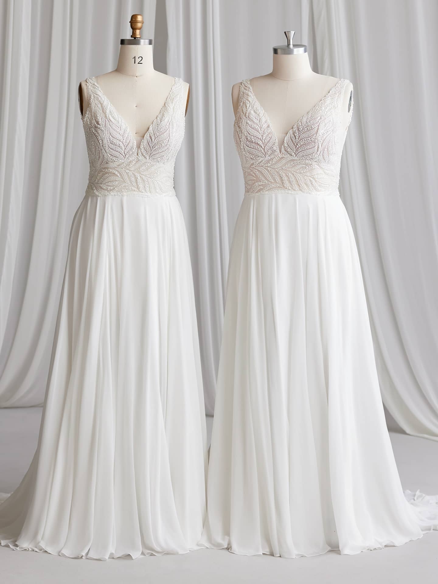 The A-line wedding dress is a classic and flattering choice for all body types, making it the most popular silhouette among San Diego brides. The A-line design gently flows out from the waist, creating a balanced, feminine shape. The Maggie Sottero lace gown with its A-line silhouette is perfect for brides who want a dress that is both elegant and comfortable. Whether you’re planning a beachside wedding or a formal ballroom celebration, this silhouette ensures you feel beautiful and confident.