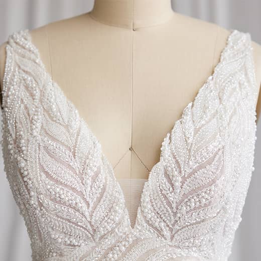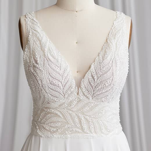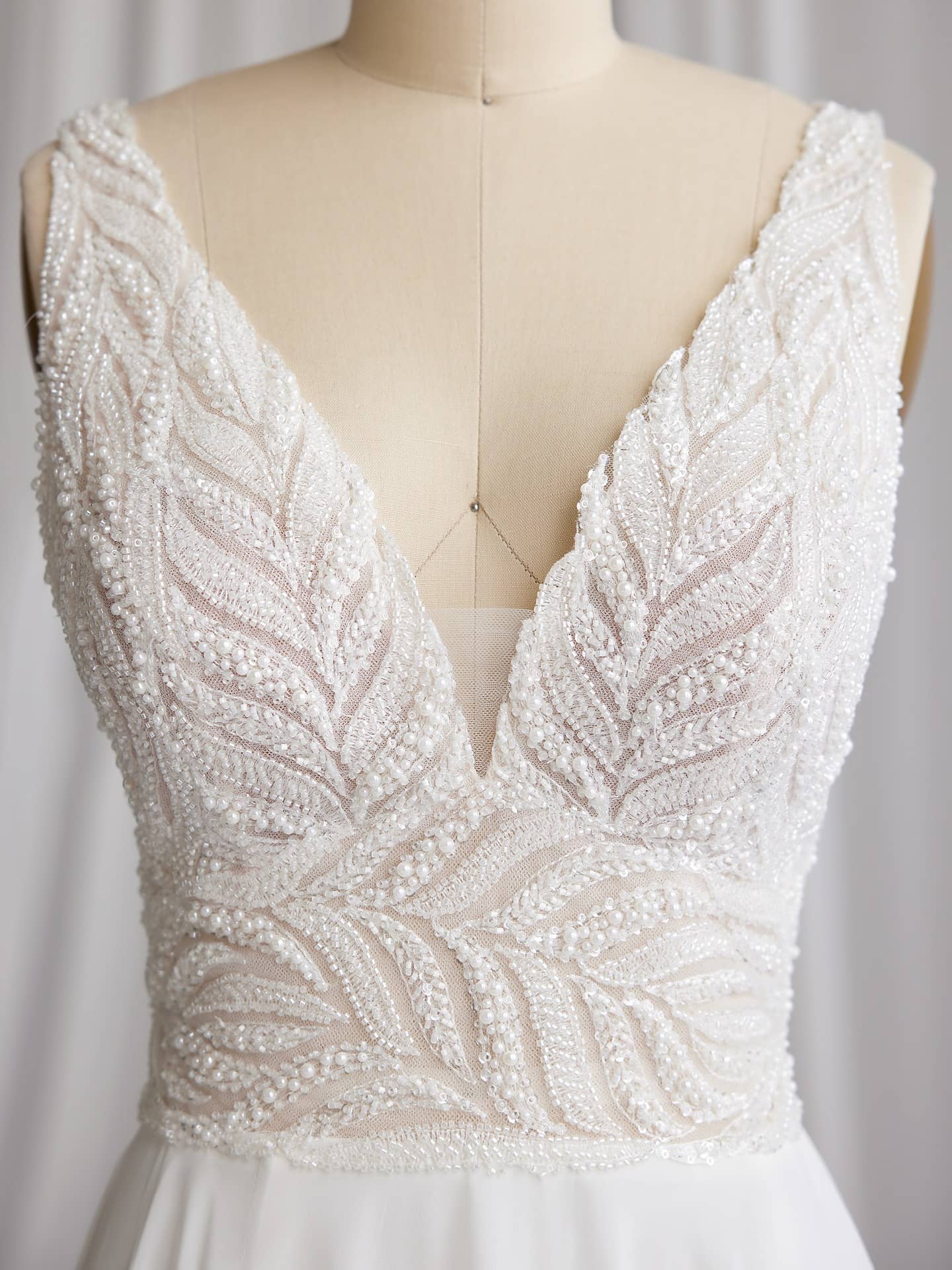 Lace wedding dresses are a timeless bridal choice, and the Maggie Sottero lace gown offers a beautiful mix of romance and elegance. The lace detailing adds texture and dimension, making the gown feel both classic and fresh. The V-neckline enhances the bride’s natural shape, elongating the neck and drawing attention to her features. This combination of lace and the V-neckline ensures a sophisticated yet romantic look that is perfect for San Diego brides.