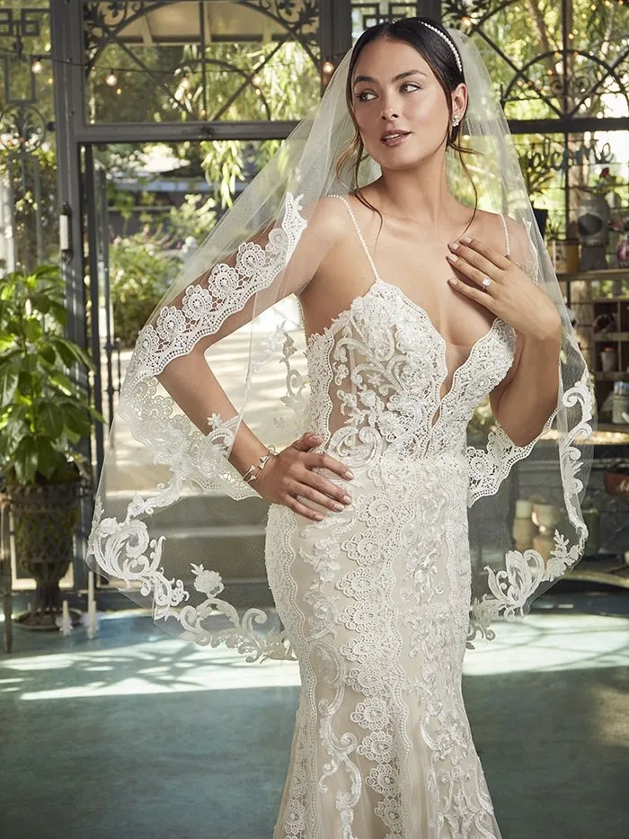 The lace detailing on the Casablanca Chiffon Fit-and-Flare Wedding Dress is a key feature that sets this gown apart from others in San Diego. Lace is often considered the epitome of romantic bridal fashion, and the lace accents throughout the bodice and skirt add a vintage-inspired charm while keeping the look fresh and modern. The lace not only creates depth and visual interest, but it also adds texture, providing a luxurious finish that enhances the overall design without overwhelming the silhouette. The plunge neckline further enhances the gown’s sexiness while still maintaining a sense of sophistication and class.