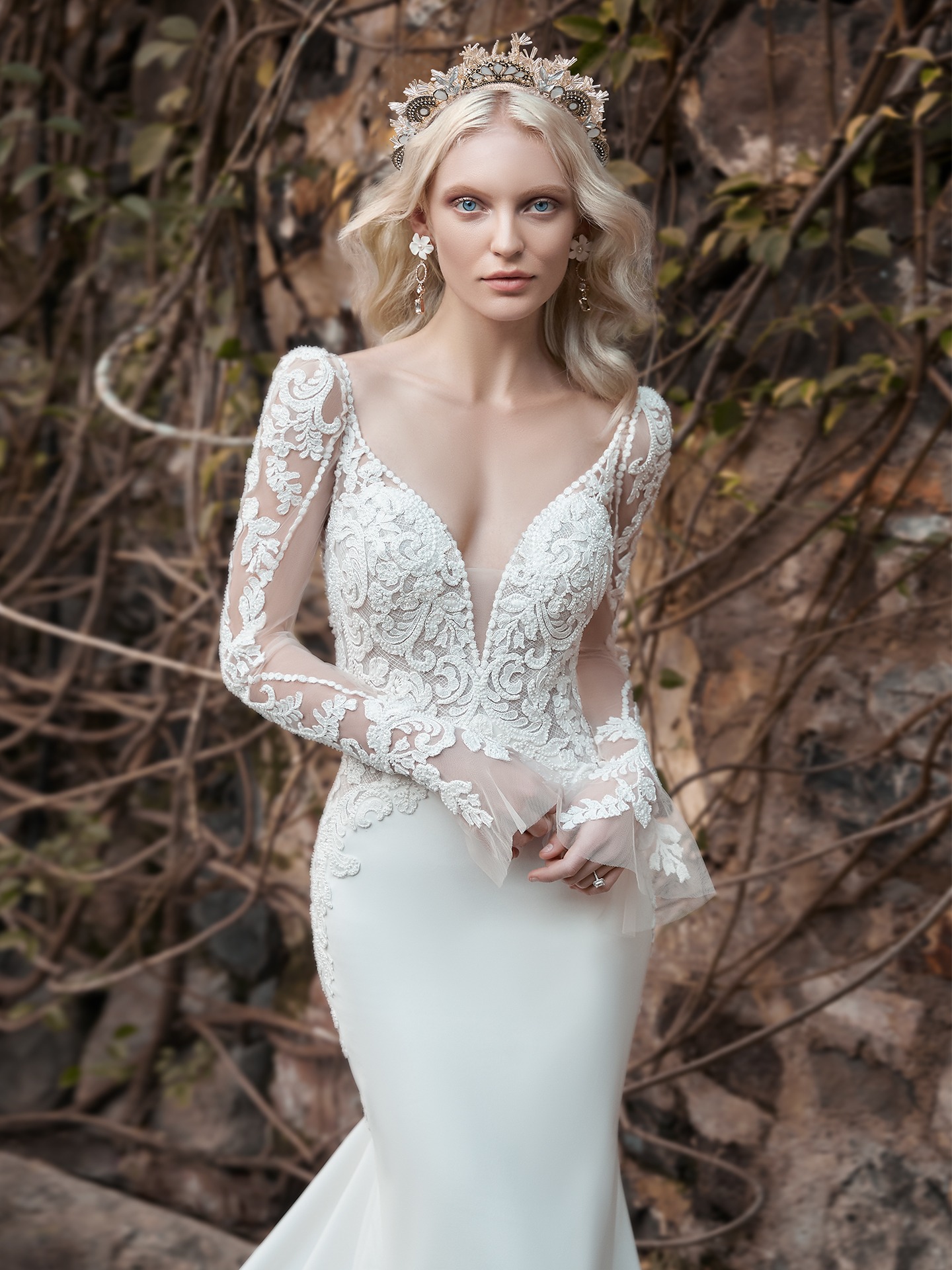 SKU: I-732 Categories:Lace, Long Sleeves, Maggie Sottero, Mermaid, Romantic, Scoop Back, Straps, V-Neck