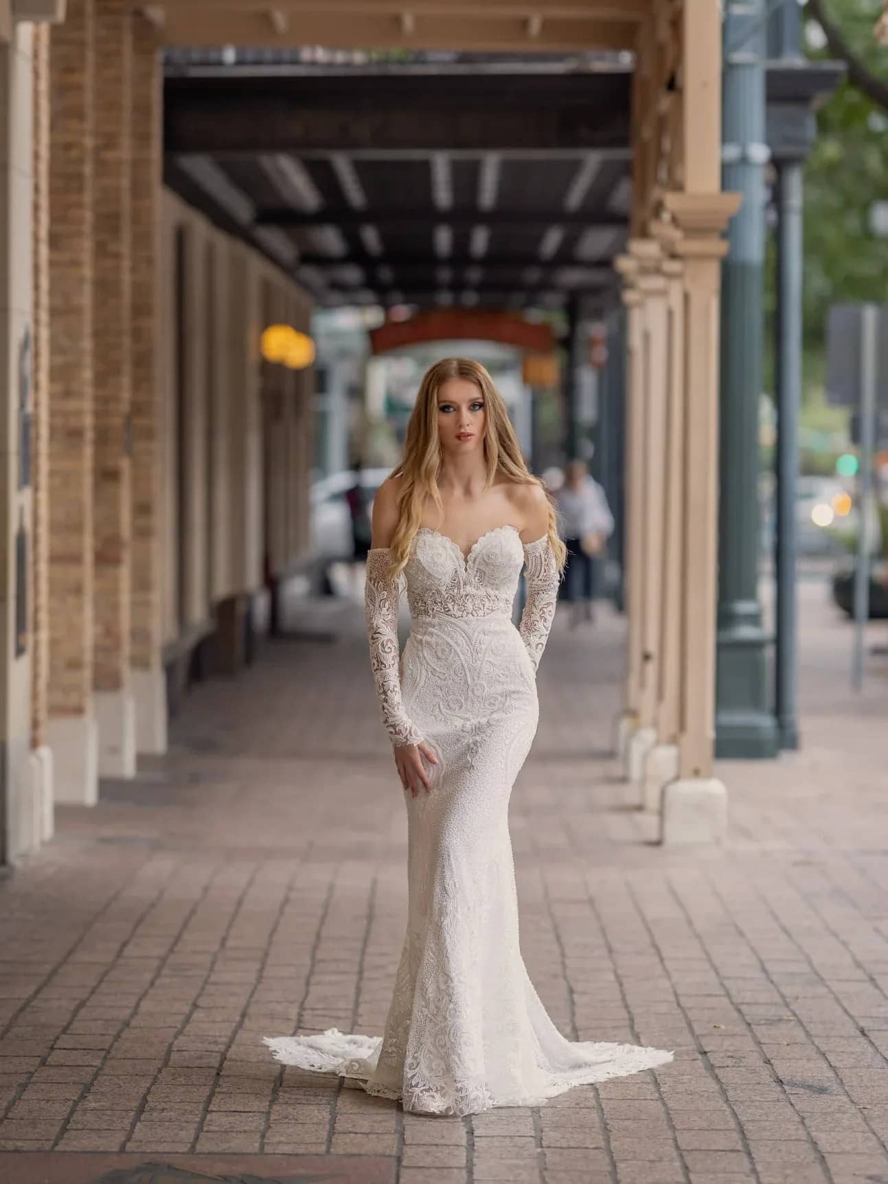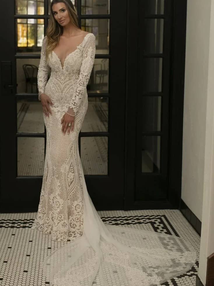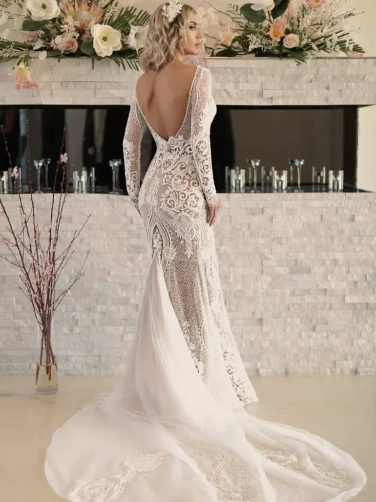 Elegance Redefined: Our Fitted Corset Creates an Enchanting Hourglass Figure in this Beaded exclusive Lace Dress, Complete with a Stunning Long Lace Train, Glittering Back, and Optional Cold Shoulder Detachable Sleeves.