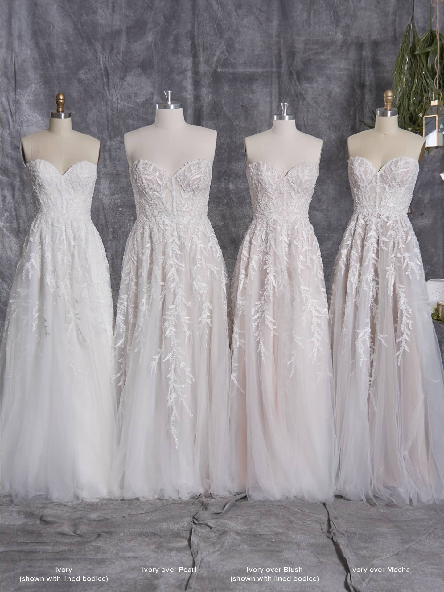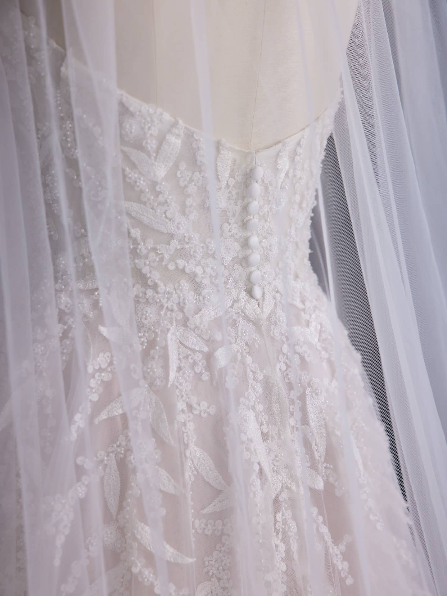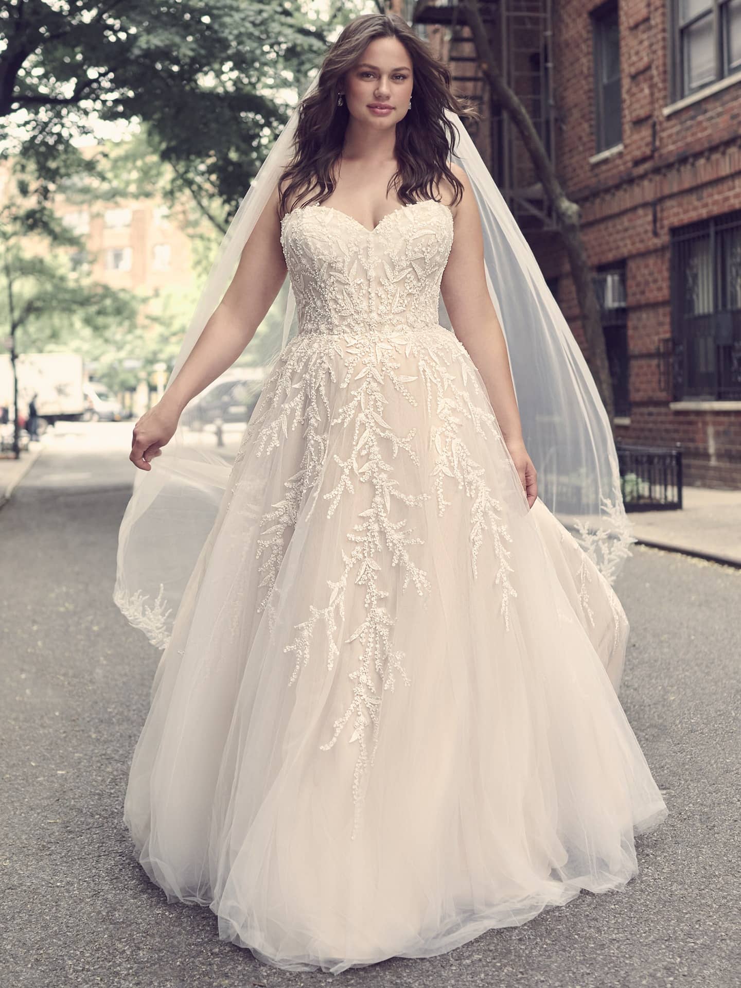 The A-line wedding dress is one of the most popular and flattering silhouettes for all body types. The A-line silhouette gently flares from the waist down, creating a balanced and feminine shape that suits almost every bride. The Maggie Sottero lace gown with the A-line fit is perfect for brides who want a chic and graceful appearance without feeling restricted. Whether you’re walking down the aisle at a formal San Diego wedding or exchanging vows in a more relaxed outdoor setting, the A-line silhouette ensures you look effortlessly beautiful.