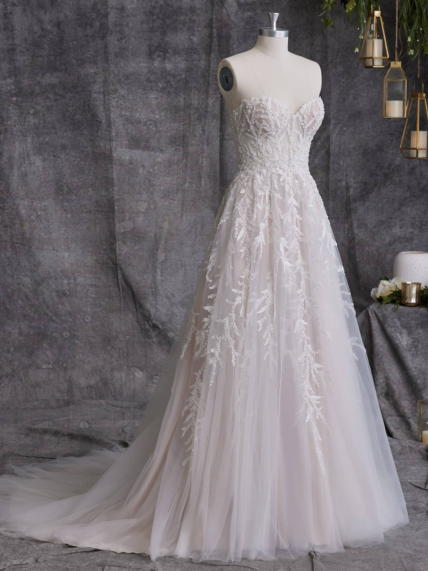 The Maggie Sottero A-Line Lace Wedding Dress is an ideal choice for San Diego brides seeking a perfect blend of timeless beauty and modern elegance. The A-line silhouette is universally flattering and perfect for all body types, gently flaring out from the waist and providing both structure and comfort. This gown features intricate lace detailing that gives it a romantic, vintage-inspired charm while still looking fresh and modern. The strapless sweetheart neckline adds a delicate yet bold touch, emphasizing the bride’s shoulders and collarbones. The tulle fabric adds a soft, ethereal feel, making it ideal for both formal and casual wedding settings in San Diego. Whether you are celebrating on a beachside or in a grand ballroom, this gown ensures you feel confident and elegant from every angle.