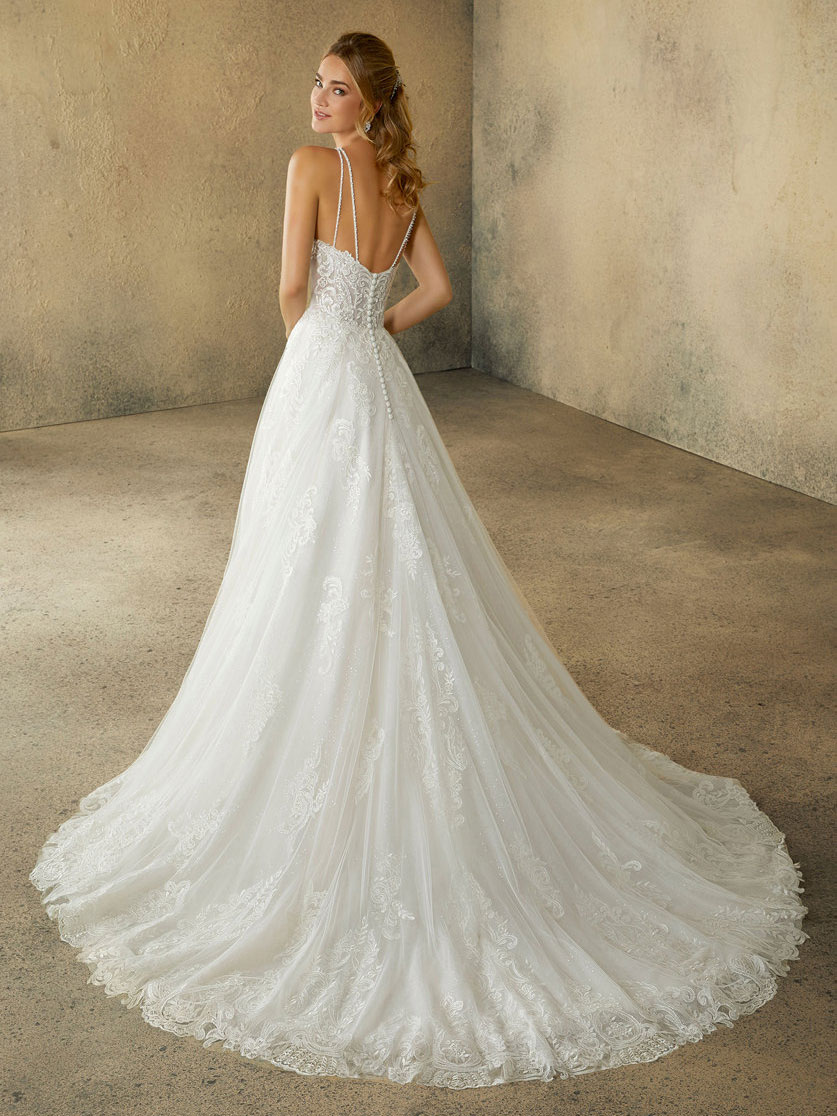 Morilee wedding dresses are renowned for their impeccable craftsmanship and exceptional fit. The A-line silhouette in this gown enhances the figure, offering a balance of shape and comfort. The halter neckline creates a flattering frame for the face, while the lace and net fabric add a delicate texture that brings out the gown’s timeless elegance. The strappy back offers a chic and modern twist, while the V-back provides a subtle glimpse of skin for added allure. This dress is perfect for San Diego brides who want a stylish, modern gown with all the romantic touches they crave. Whether you’re hosting a formal ballroom wedding or an intimate beach ceremony, this gown adapts beautifully to any venue and wedding style.